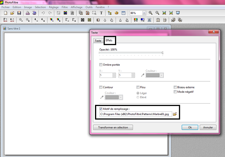 Avant de cliquez sur OK, rendez-vous dans l'onglet Effets et sélectionnez un motif de remplissage en allant chercher l'image de votre choix.