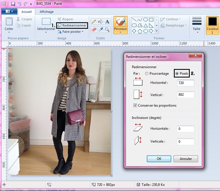 Le logiciel le plus simple du monde ! J'utilise beaucoup Paint pour redimensionner mes photos. Pour garder la proportion d'origine : Redimensionner -> Sélection par "Pixels".