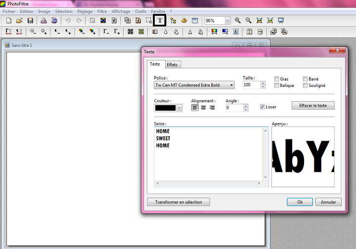 Pour réaliser vous aussi un texte texturé, voici les instructions : dans Photofiltre, insérez votre texte sur un fond de votre choix en allant sur l'icone T et en remplissant le champ "Saisie". Réglez la taille, la police (une police assez épaisse pour voir suffisamment la texture), l'angle et la couleur.