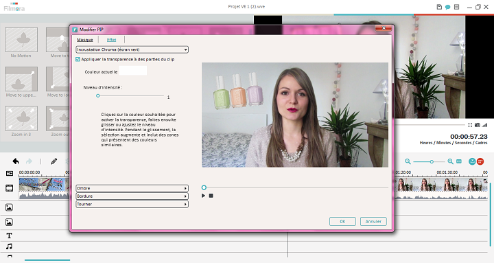 En double cliquant sur l'image dans la zone de montage, puis en cliquant sur "Avancé" on arrive sur un menu dans lequel il est possible d'"Appliquer la transparence à des parties du clip". Grâce à une pipette il est possible de sélectionner le fond blanc et de le rendre transparent dans la vidéo. Les vernis ont désormais une jolie intégration dans ma wishlist.