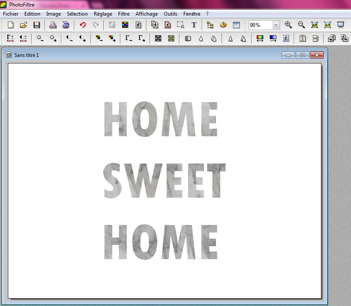 J'utilise très peu Photofiltre et je n'en connais pas toutes les fonctionnalités, mais je sais que c'est le logiciel que j'utilise lorsque je veux ajouter de la matière à un texte. Pour ma chambre j'avais envie d'un cadre dans lequel seraient inscrits des mots en lettres dorées. Photofiltre m'a permis de créer mon texte et de le remplir avec la texture de mon choix.