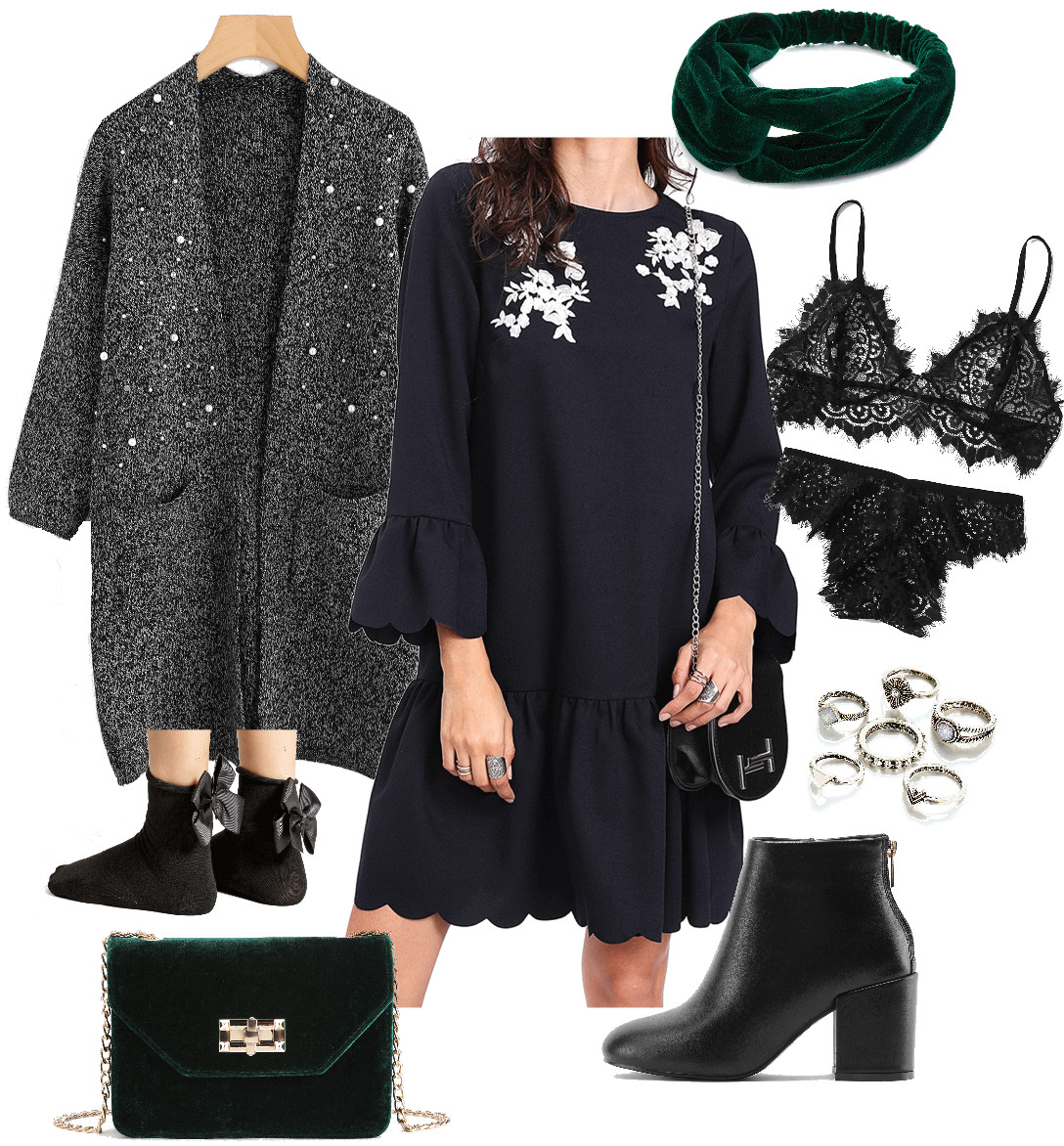Hello tout le monde, je vous sors la tenue Shein tôt ce matin car j'imagine que ce soir les préoccupations ne seront plus au shopping ni à la mode. Niveau tenue, une robe bleu marine et un gros gilet, parfait pour être au chaud tout en restant totalement féminine. J'hésite à commander la robe que je trouve vraiment canon : les broderies, la coupe, la couleur.. Le gilet est brodé de perles, et la coupe est longue, ce qui est parfait avec la robe. Gros coup de cœur également sur le sac, reste juste à se décider sur la couleur : cette merveille existe aussi en noir et en bordeaux. On assortit le sac à un turban en velours, et on ne néglige pas sa lingerie avec un ensemble noir tout en dentelle sans armature. Pour les chaussures, j'ai hésité à mettre des bottines plus rock, à sangles, et j'ai finalement choisi celles-ci, simples mais carrément efficaces. On les accessoirise avec ces chaussettes à nœuds, qui ressemblent fortement aux Calzedonia.