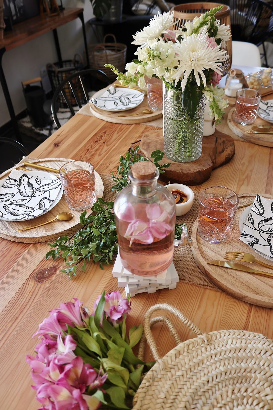 Au niveau de la vaisselle, des assiettes à dessert Ikea, des couverts dorés Made.com et mes verres chouchous de Action, qui s'accordent totalement avec ce nouveau vase (Sostrene Grène pour 6€ à peine). Pour la décoration, un peu de feuillage que j'ai piqué dans le bouquet, un sac en osier et des fleurs à l'intérieur, une lanterne en bois Éphémère Concept Store. Je suis restée dans cette couleur assez neutre. N'hésitez à piquer ici et là quelques objets déco de votre maison pour agrémenter un peu votre table. L'idéal est de jouer sur les niveaux et d'apporter des objets de différentes hauteurs pour donner du relief et un aspect vivant.