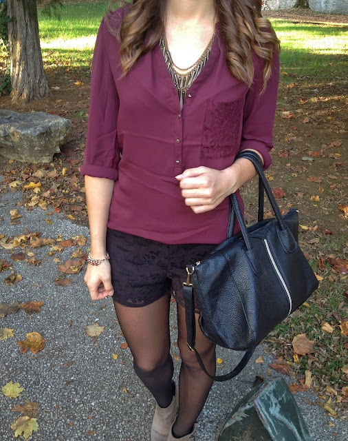 40. Very nice outfit!! Wonderful combination! Love those lace shorts and those are my favorite color tights!!! You look AMAZING!!! Great photos! :)