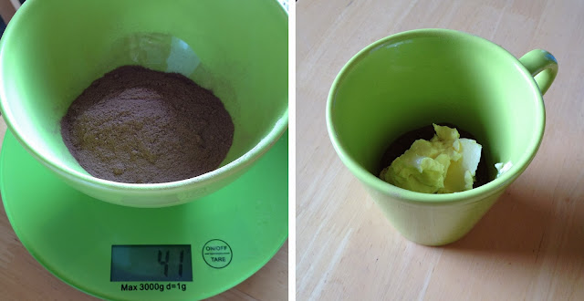 Première étape, déposer les 40 grammes de Nesquik et les 30 grammes de beurre dans le Mug.