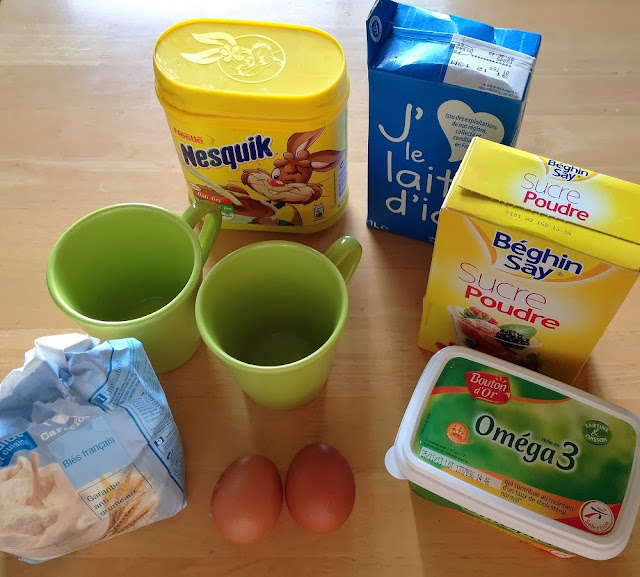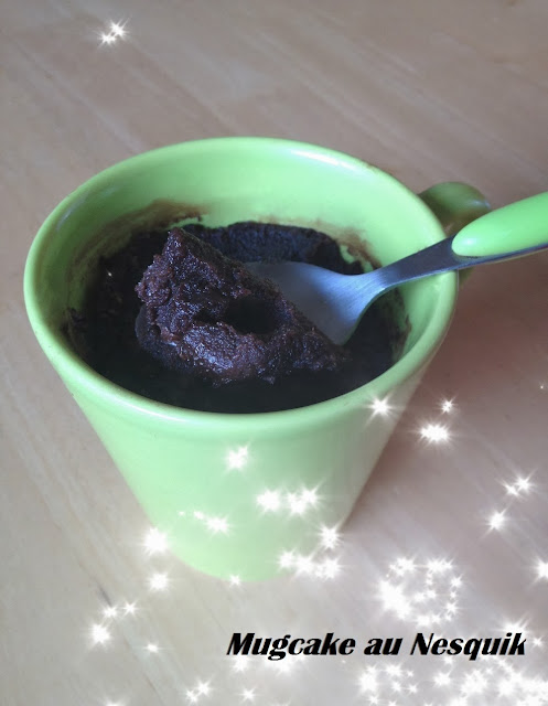 Petit article qui sort de l'ordinaire aujourd'hui, puisque je vous propose de parler cuisine. Une copine m'avait parlé du Mugcake (ce petit gâteau fait dans une tasse et cuit en 1 ou 2 minutes) et j'ai voulu tester ça. J'ai trouvé une recette sur l'appli Marmiton, et je l'ai adapté avec mes proportions et du Nesquik.