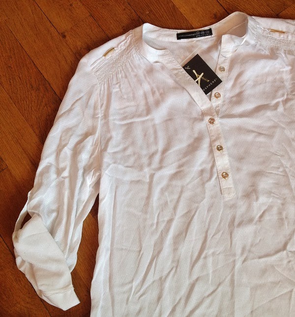 Troisième et dernier haut, cette petite blouse blanche, avec des détails dorés aux épaules. Tout comme la précédente elle existe dans pleins de coloris, et la rouge était juste superbe ! Malheureusement il ne restait plus que des grandes tailles dans cette couleur.