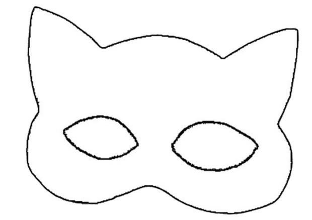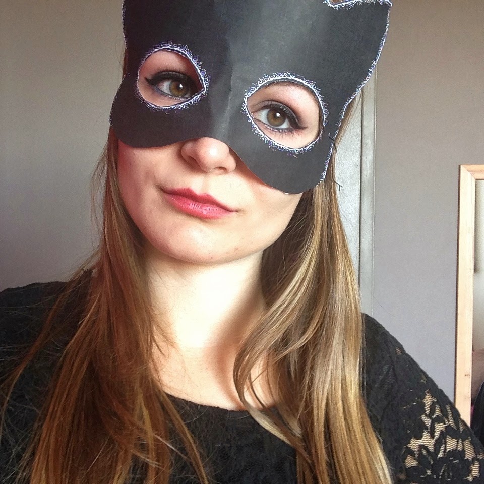Niveau make-up : deux possibilités : imprimer comme moi un masque (à télécharger ici), avec un maquillage des yeux et de la bouche assez prononcé. Deuxième option : remplacer le masque par un maquillage au crayon noir comme ici, et fabriquer un serre-tête avec des oreilles de chat.