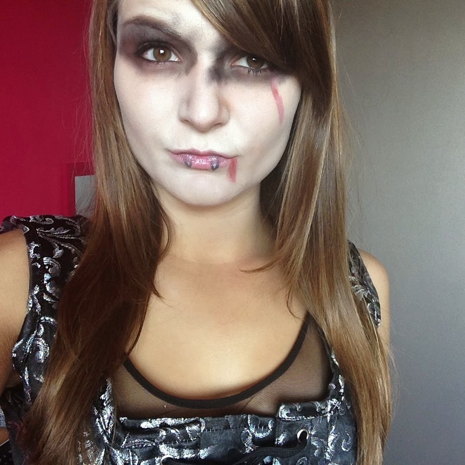 Niveau make-up : On insiste sur les yeux avec du fard noir. Pour le teint un peu blanchârte, pensez à utiliser un fond de teint un peu trop clair pour vous, et si possible dénichez des fausses dents de vampires (je n'en avais pas donc je les ai simplement dessinées). Un peu de rouge à lèvres et c'est parfait.