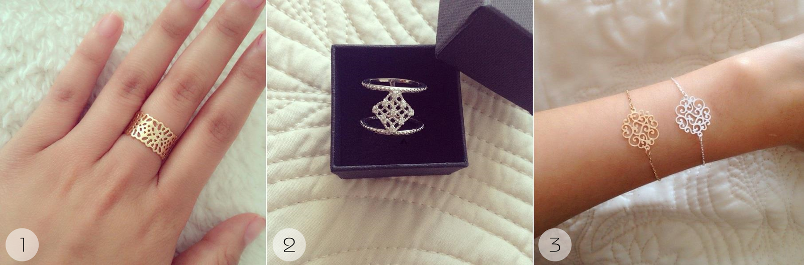 1. Bague rosace, 31 € / 2. Bague orientale, 39 € / 3. Bracelets romance, 27 €