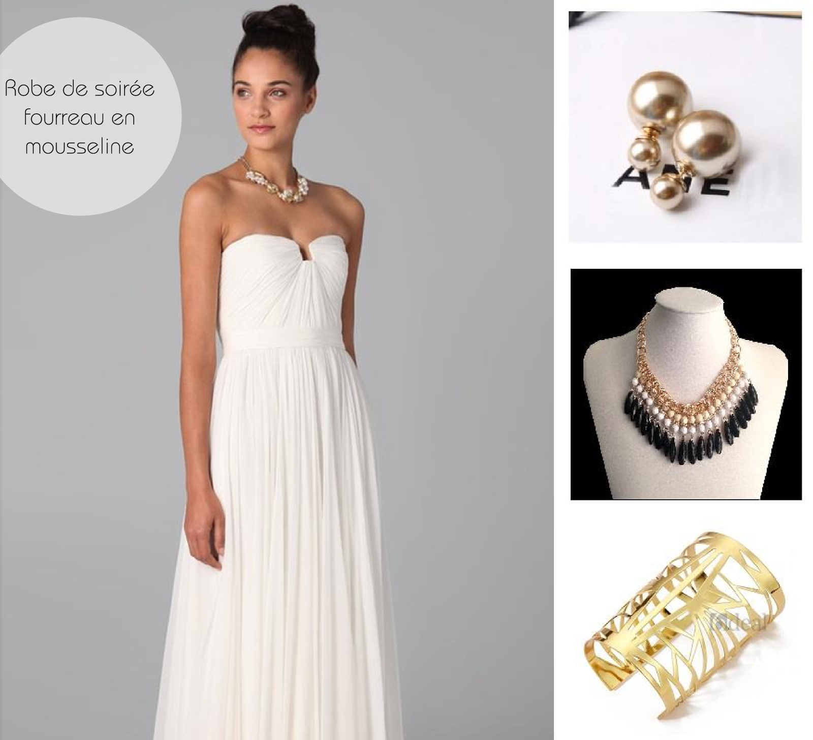 Cette jolie robe longue et blanche est assez facile à accessoiriser, ici avec de jolis bijoux dorés. Avec ce collier, autant privilégier des petites boucles d'oreilles rondes, mais en restant toujours à la mode avec cette forme de BO originale, tout droit inspirée des Dior.