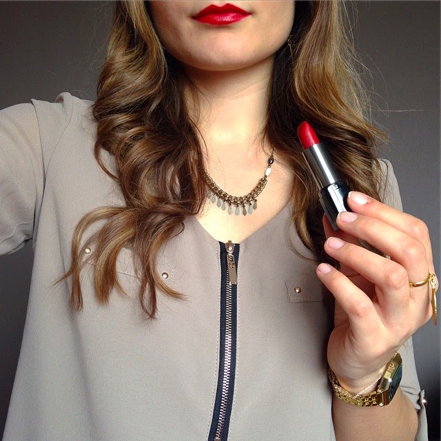 That shade of red is very pretty! You lips look luscious!! You are so beautiful!! Very nice outfit too! :) xx
