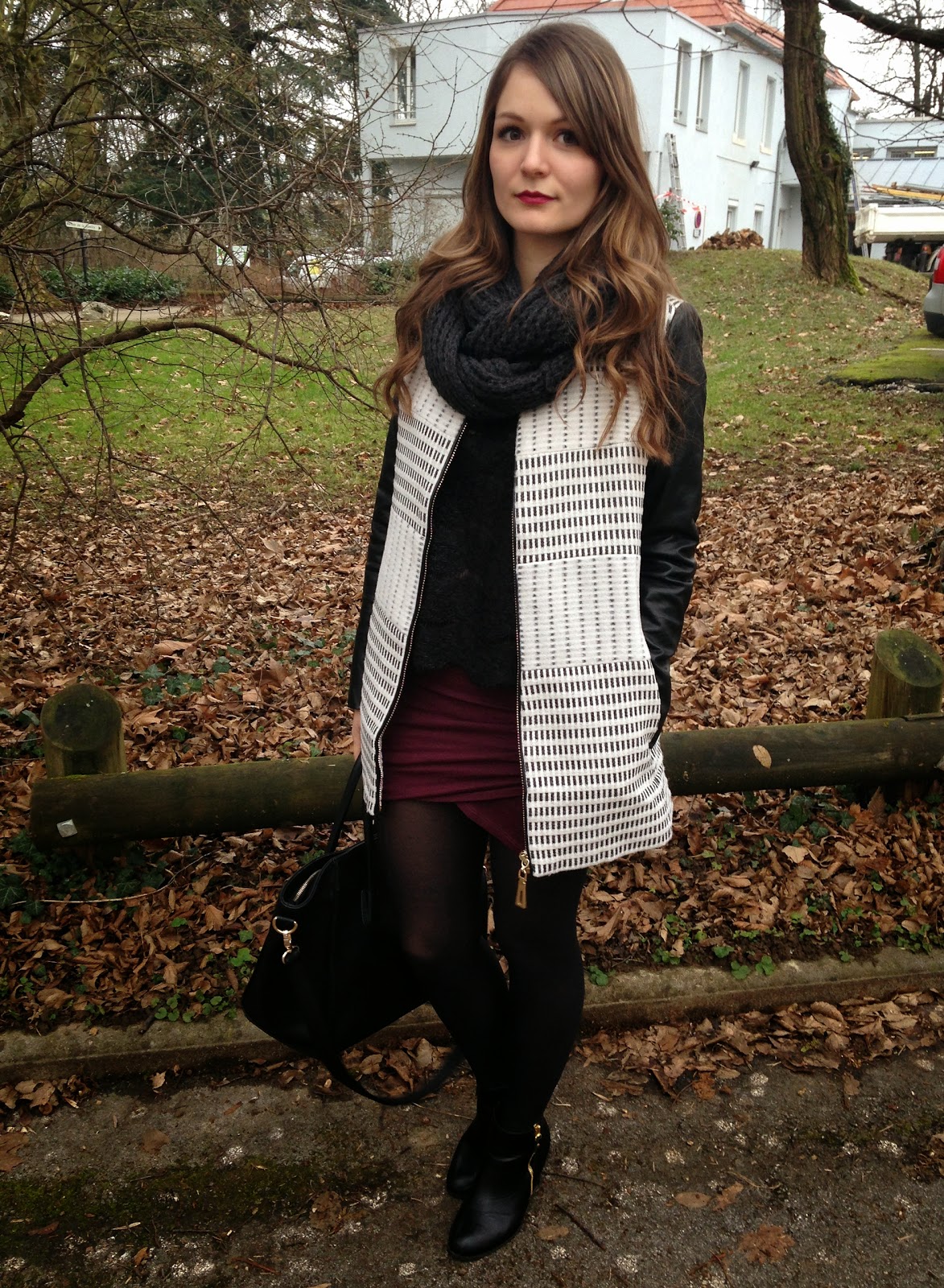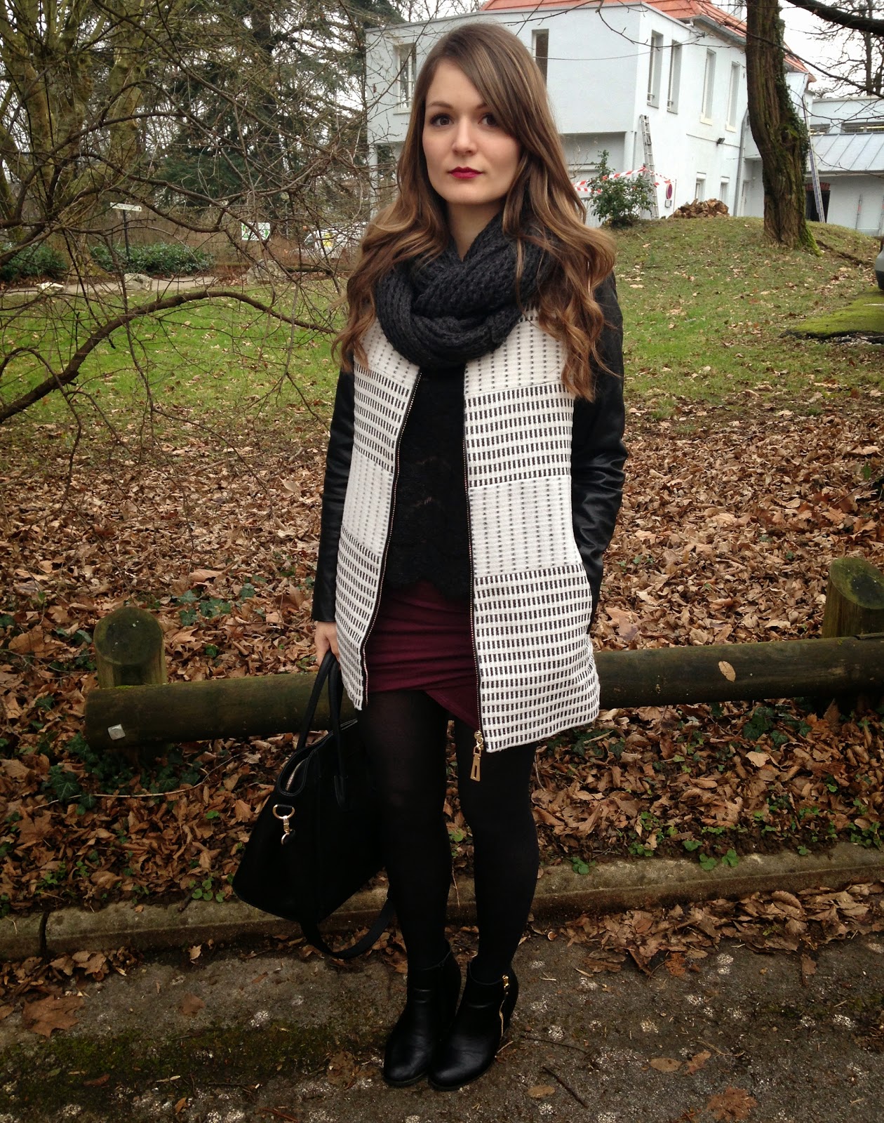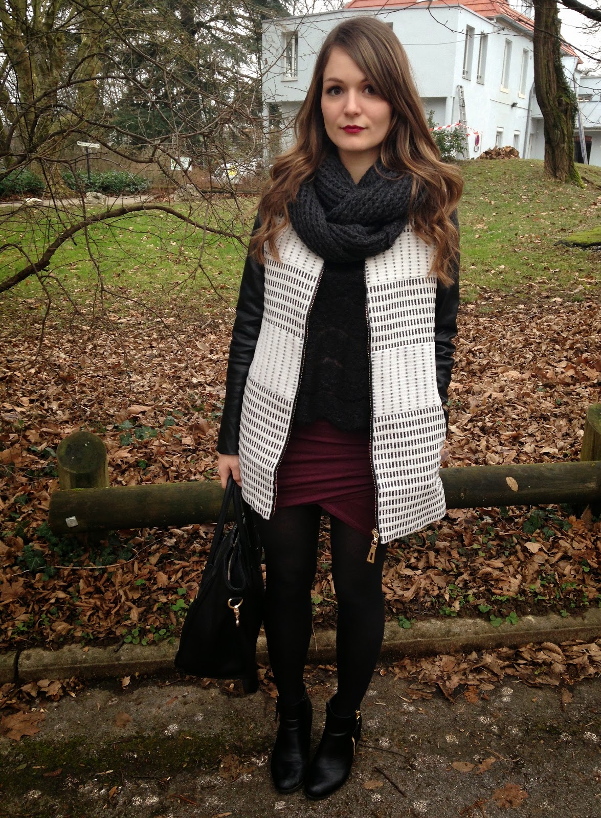 très jolie tenue, le manteau a l'air idéal pour affronter ses températures et j'adore ta jolie jupe drapée bordeaux!