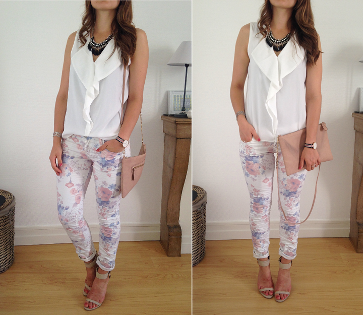 Le petit haut et le joli pantalon fleuri viennent également du site et sont déjà adoptés ! J'aime beaucoup les hauts blancs en général, je trouve ça facile sous un blazer, rentré dans un short loose ou une jupe drapée. Le pantalon sent bon l'été, j'adore l'imprimé.
