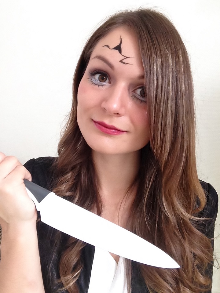 Le make-up : On agrandit ses yeux et on force sur le mascara. On dessine une fêlure sur le front et pourquoi pas d'autres cicatrices.