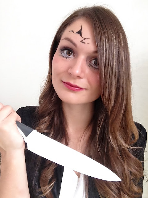 Le make-up : rien de sorcier, on se blanchit le visage (un fond de teint trop clair appliqué assez généreusement sera parfait), on se dessine des spirales sur les joues et on joue le smocky sur les yeux. On termine par des lèvres bien rouges et deux traits noirs pour l'effet bouche désarticulée. On obtient ainsi un make-up d'Halloween hyper simple avec du maquillage qu'on utilise au quotidien.