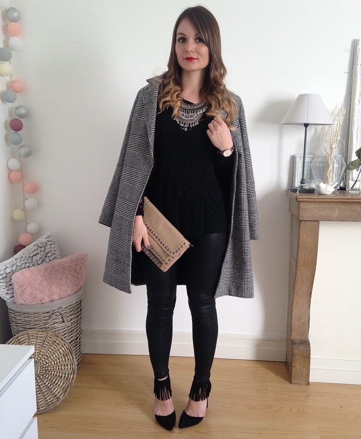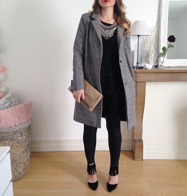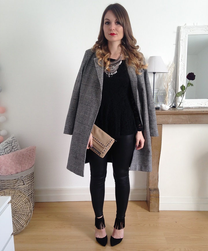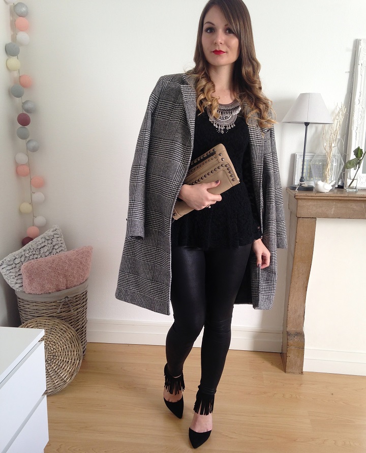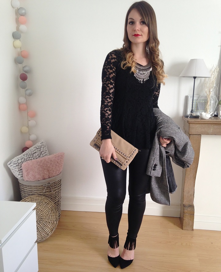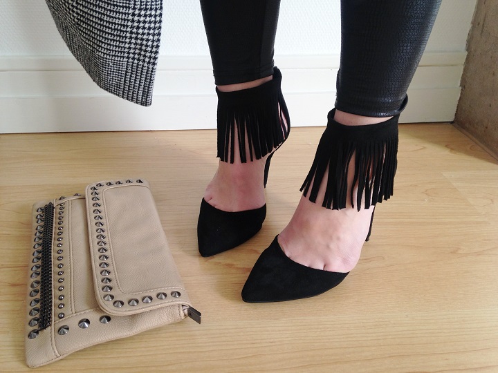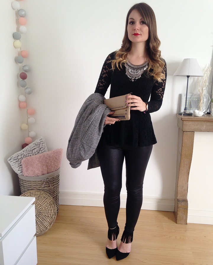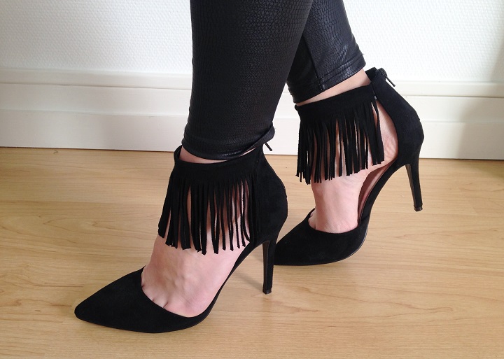 Aujourd'hui niveau tenue c'était black mood. Du noir oui, mais un mélange de matières : de la dentelle, du simili et de petites franges aux pieds. J'ai déniché ces escarpins noirs avec franges sur le site Modress (souvenez-vous, je vous montrais il y a peu mes cuissardes chouchous trouvées sur ce e-shop). Quand je cherche des escarpins femmes pas chers ou des sacs et chaussures femme particuliers, je trouve souvent ce qu'il me faut sur ce site.