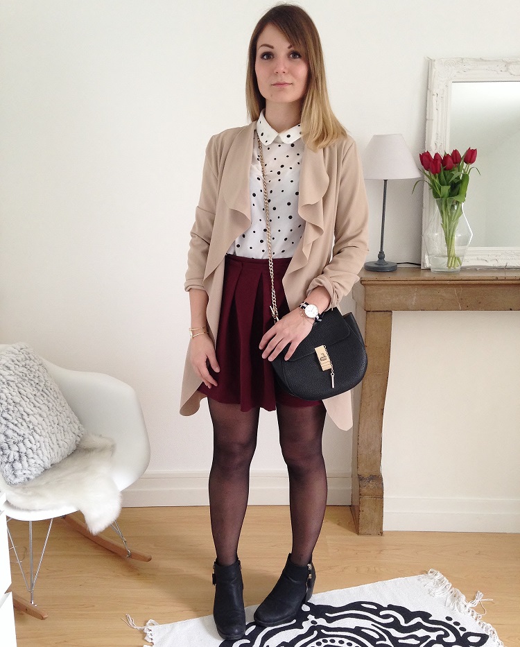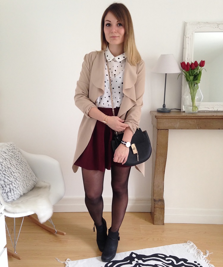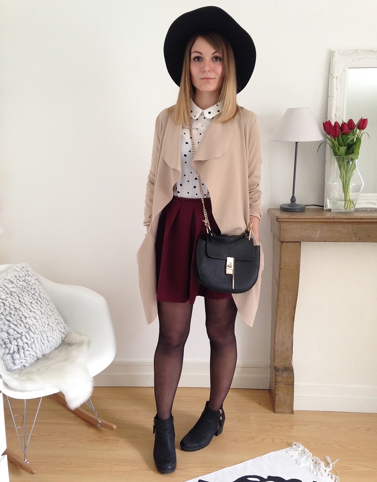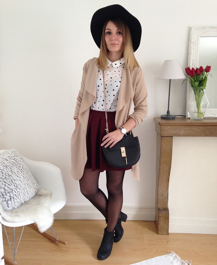RépondreSupprimerTa tenue est parfaite ! J'adore cette jolie chemise avec cette jupe bordeaux, ton chapeau et ton trench <3