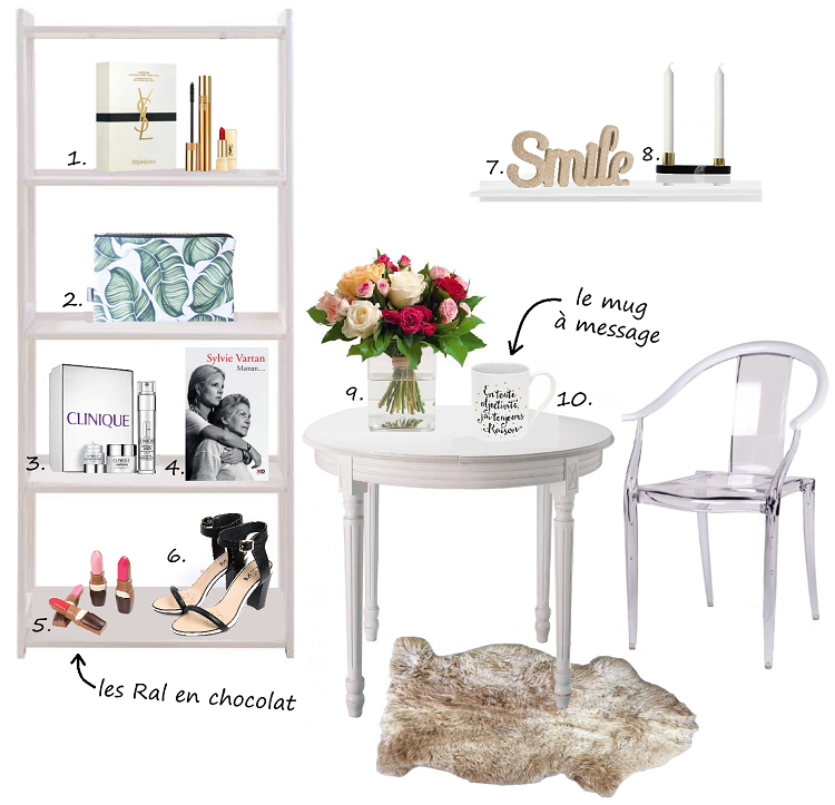 1. Coffret Mascara Volume - Yves Saint Laurent / 2. Trousse tropicale - Dorinus Illustrations sur Etsy / 3. Coffret Clinique - Origines / 4. Livre Maman - Fnac / 5. RAL en chocolat - Dlys Couleurs / 6. Chaussures - 3 Suisses / 7. Déco Smile - Maisons du Monde / 8. Bougeoir marbre et laiton - Wadiga / 9. Bouquet - Interflora / 10. Mug - Crea-bisontine.