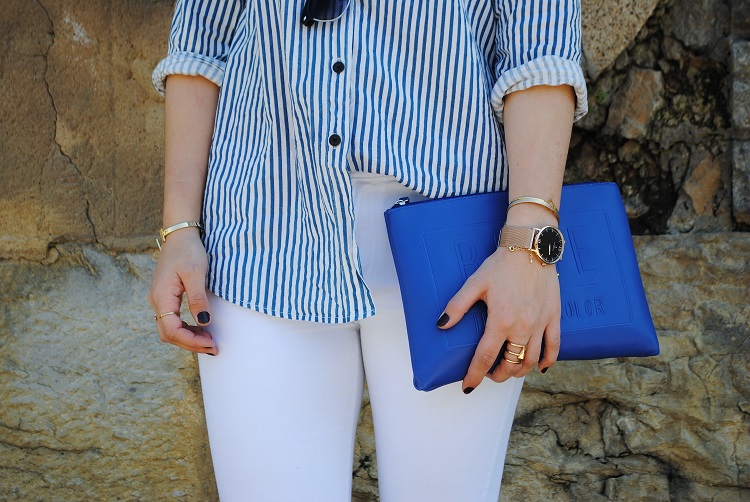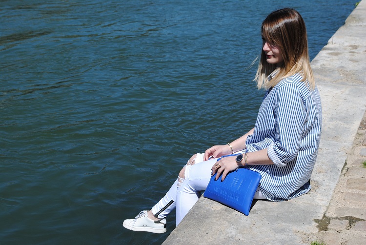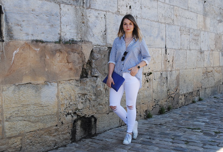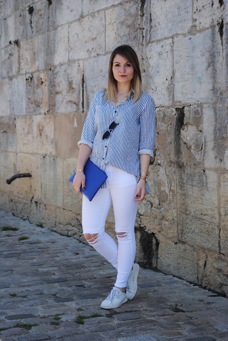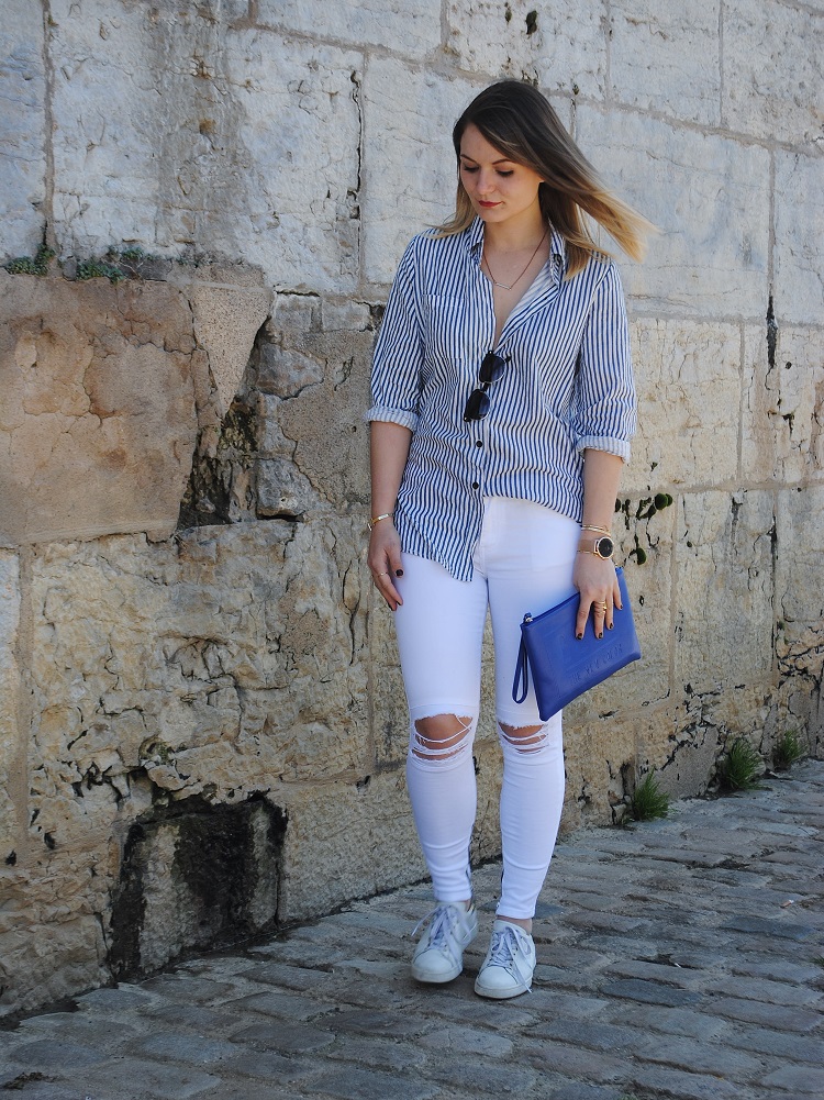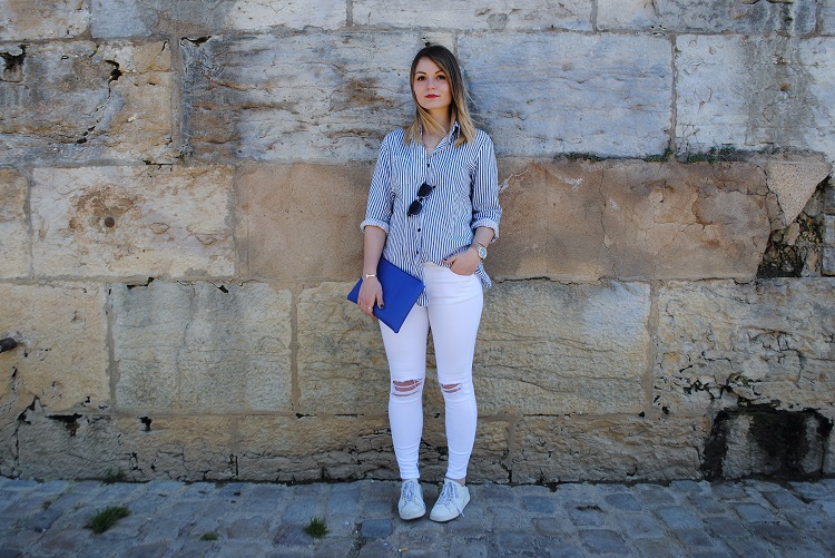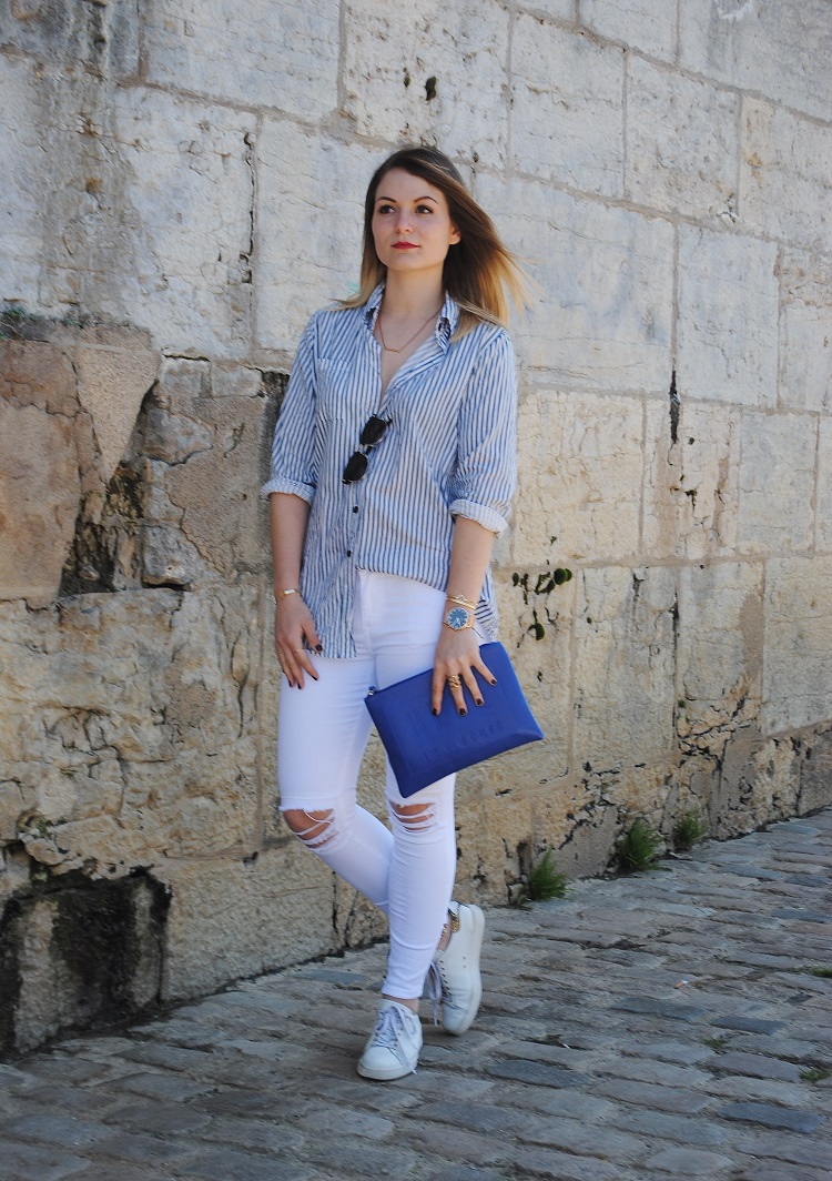J'adore le jean blanc avec la chemise bleu, ça change de la traditionnelle marinière.