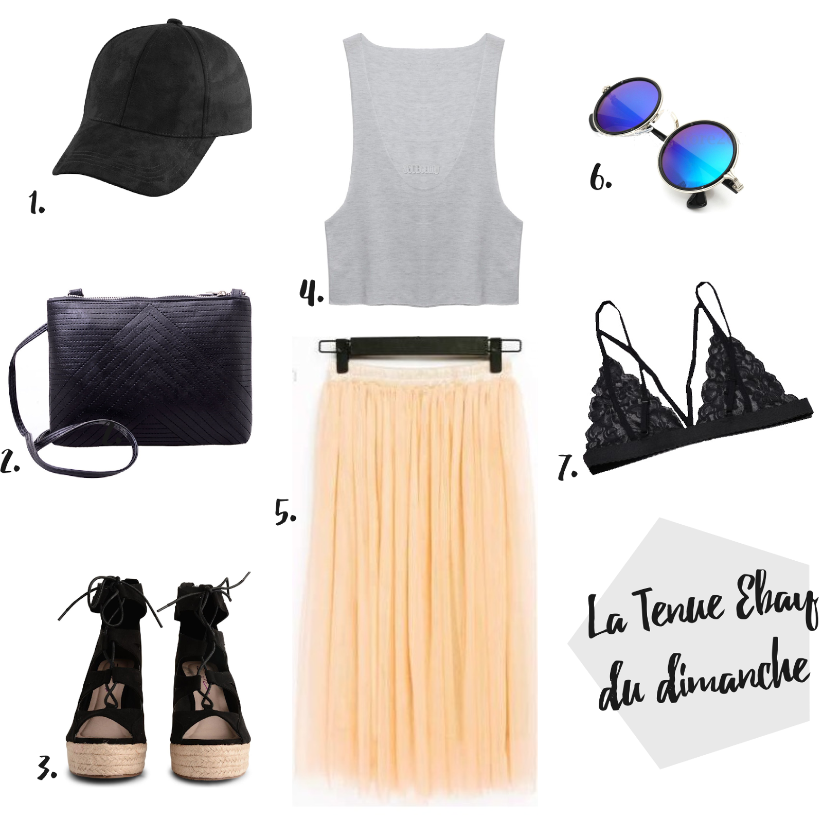 1. Casquette en suédine - 3.82 € / 2. Pochette noire - 3.97 € / 3. Compensées lacées - 33.64 € / 4. Débardeur gris - 2.72 € / 5. Tutu - 6.32 € / 6. Lunettes de soleil ronde - 4.49 € / 7. Dentelle noire - 3.10 €.