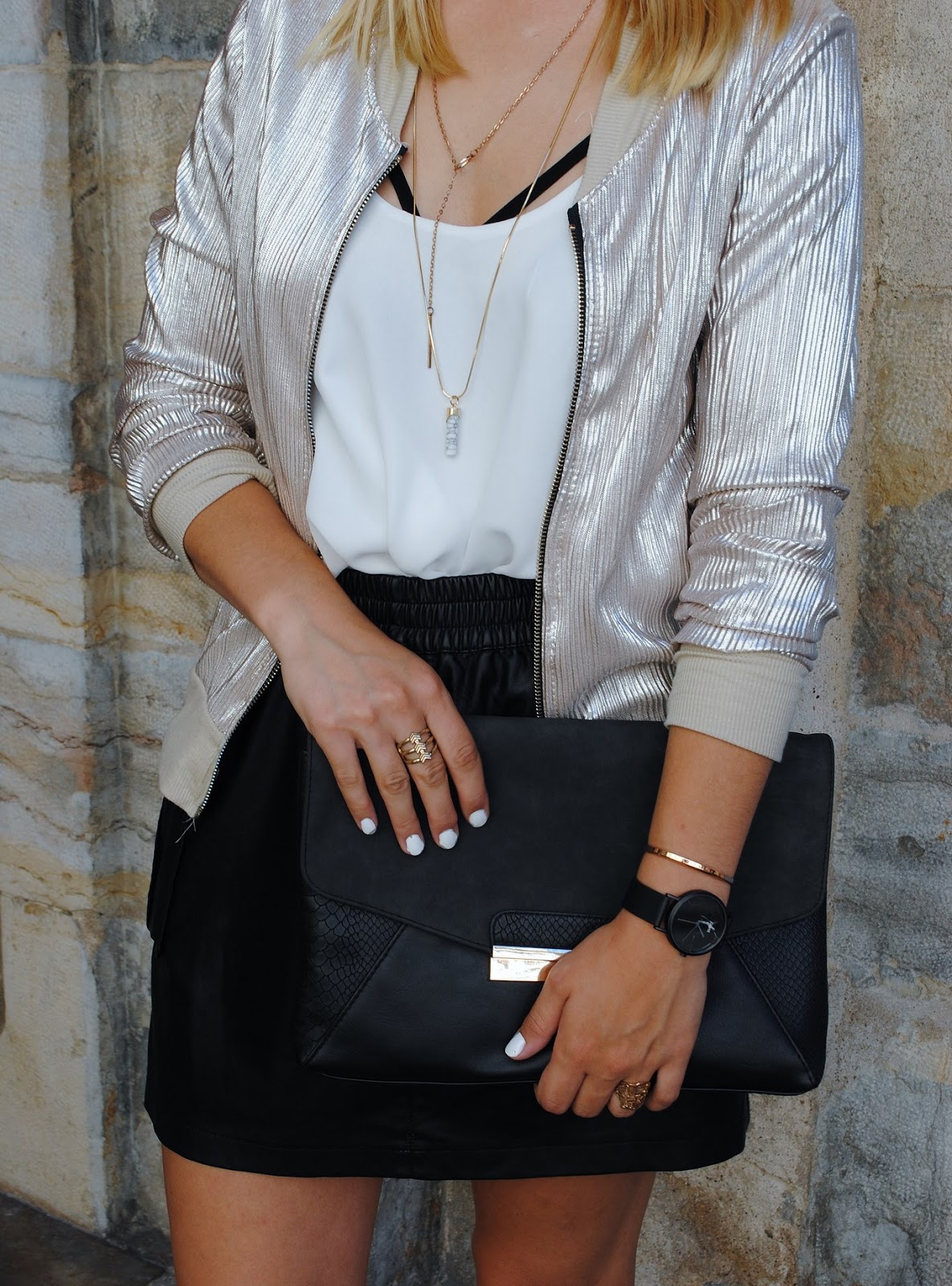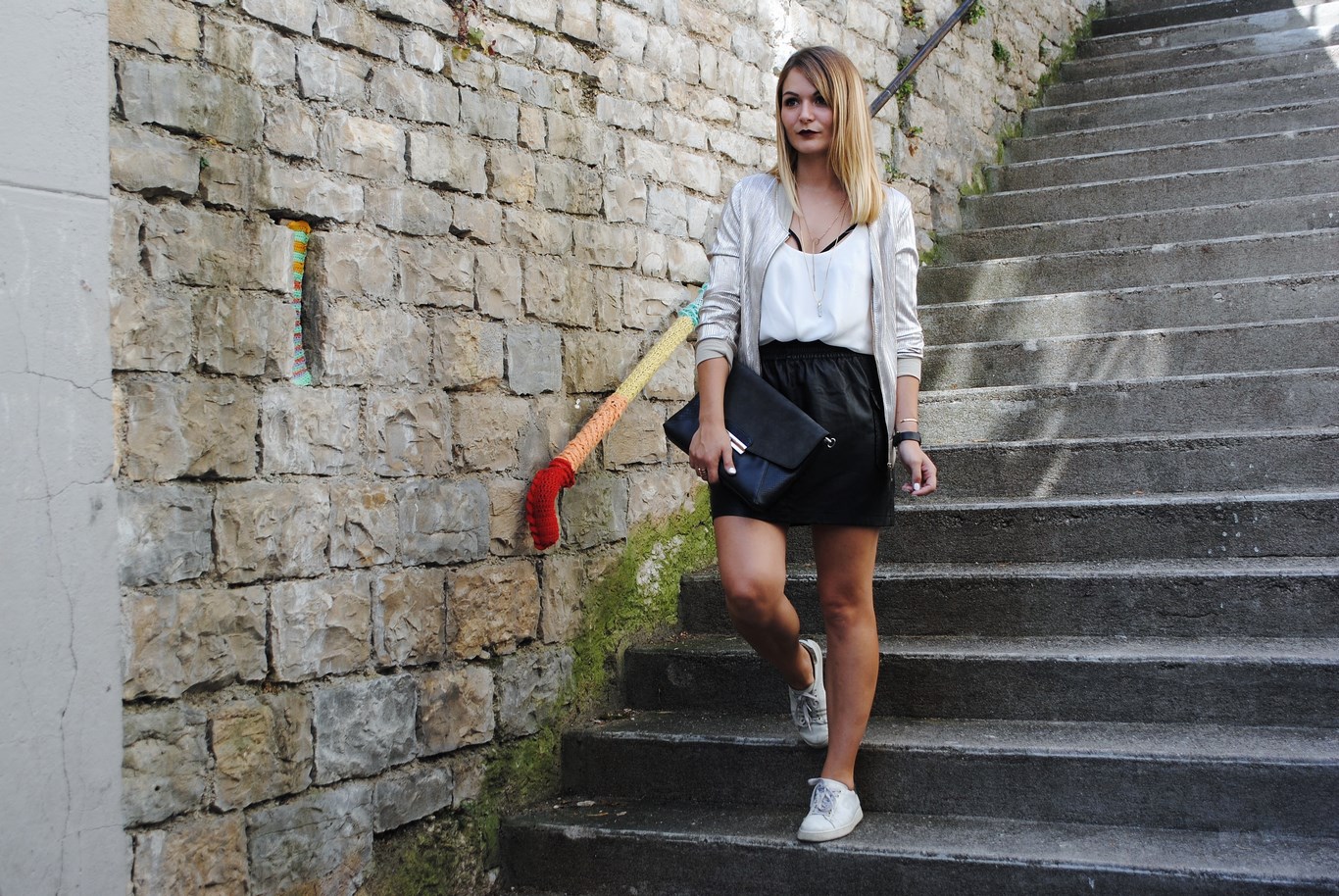 Ma commande Pretty Wire m'a réservé de bonnes surprises, comme ce bomber lamé doré : une vraie merveille ! Associé pour sa première sortie à du cuir et des sneakers, dans cette jolie cour du centre-ville.