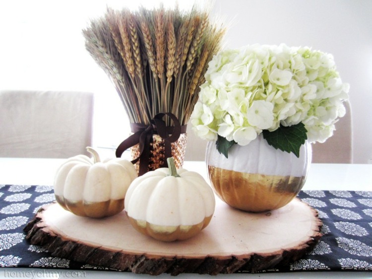 On s'inspire : des citrouilles blanches/gold, faciles à réaliser avec du gros scotch et de la peinture en bombe, de la citrouille pot de fleur, de l'association avec l'épi de blé.