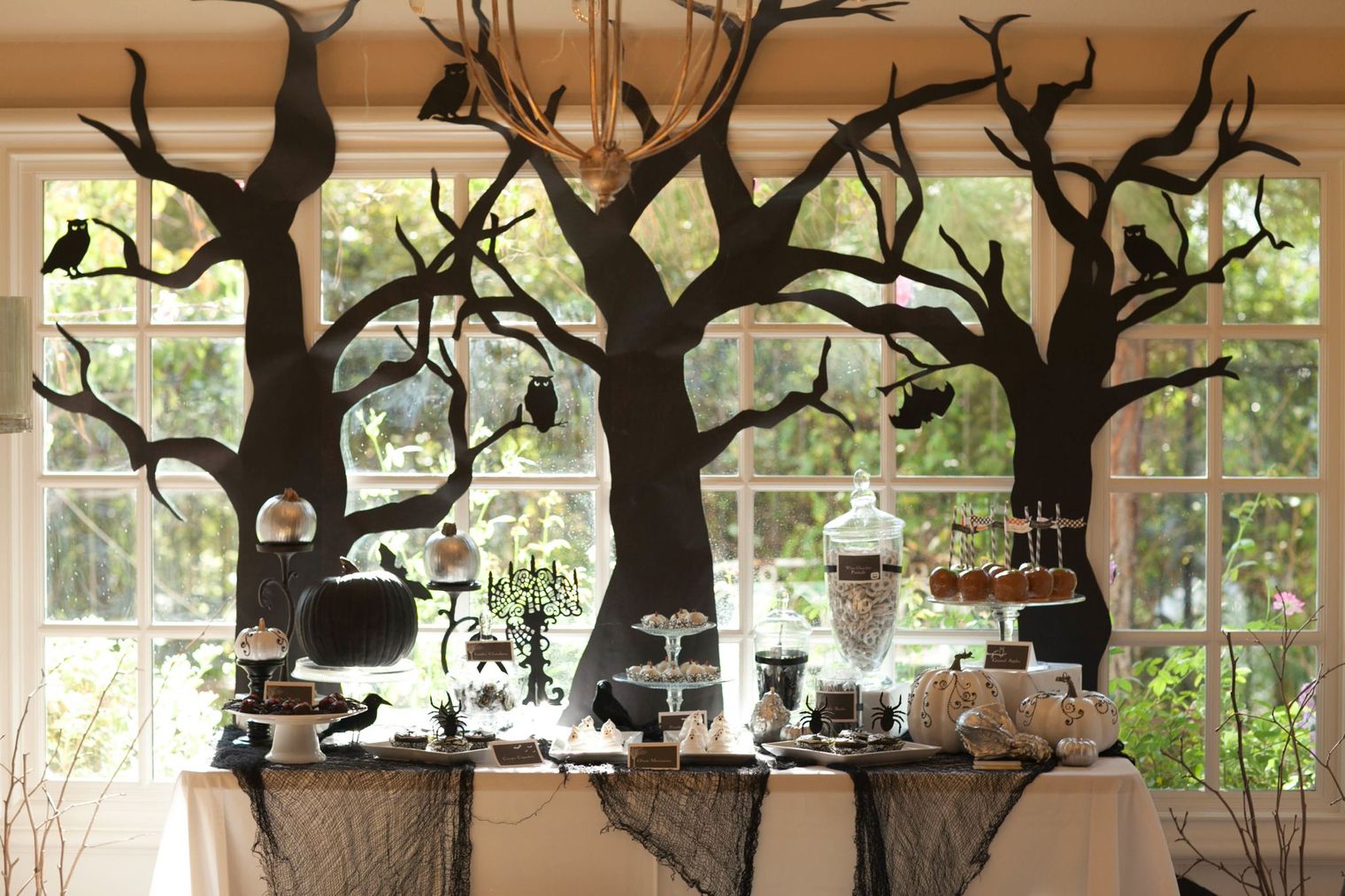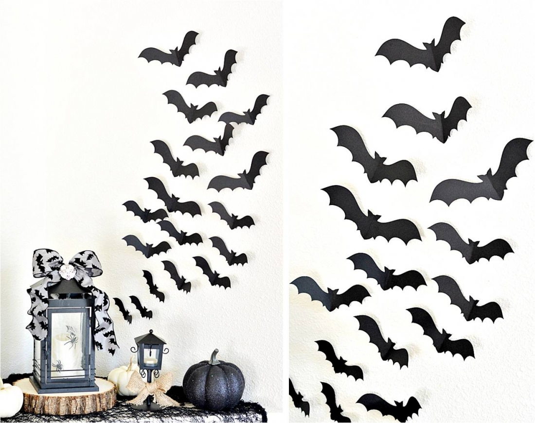 On s'inspire : des chauve-souris en papier à disposer sur un mur pour un effet garanti, des araignées dans la lanterne, de la citrouille noire pailletée.