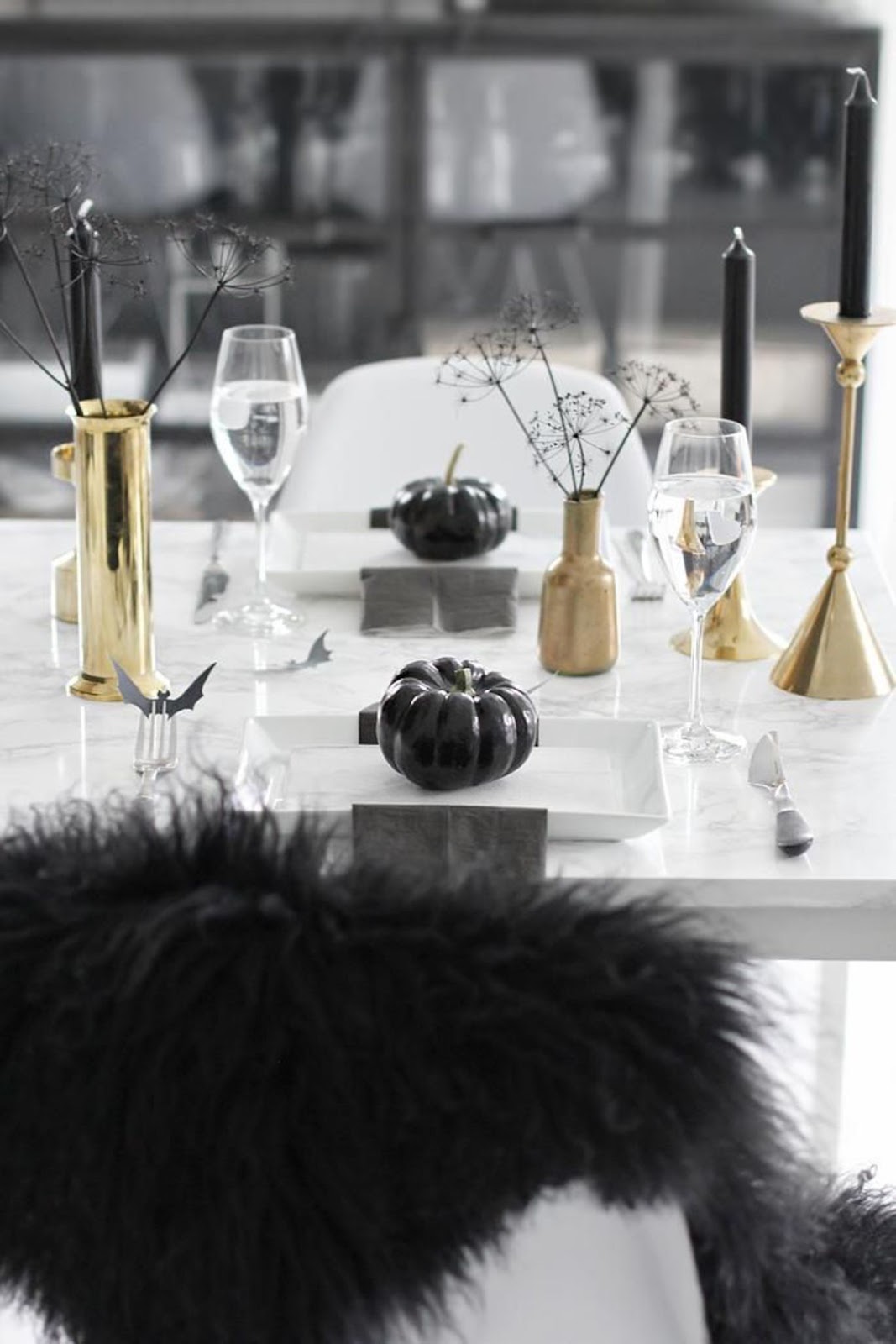 On s'inspire : de la table sobre, des citrouilles peintes en total look black, de l'association du noir, du doré et du marbre.