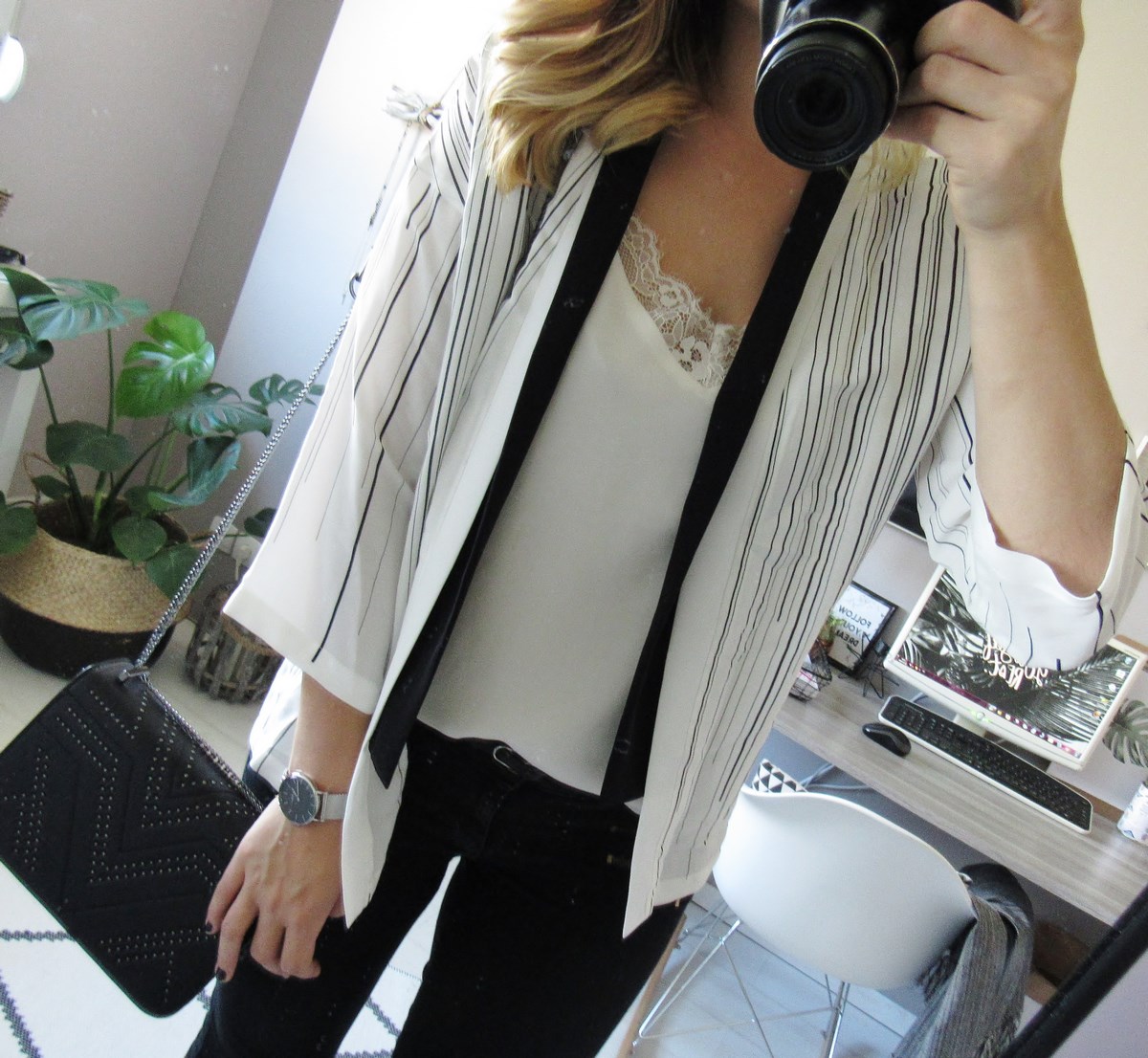 Grâce à Estelle, Raphaëlle, Anthony, Ana et Lara j'ai eu à mon anniversaire un bon d'achat Cop.Copine, l'occasion de craquer sur une pièce de qualité. S'ajoute à cela de grosses réducs en ce moment en boutique, ce qui m'a permis de craquer sur ce blazer/kimono rayé, déjà repéré dans le book. J'ai pris un S, ma taille habituelle.