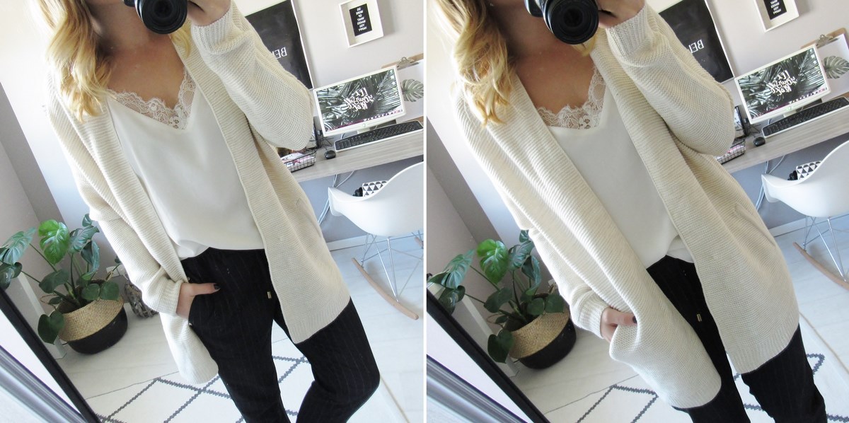 Pimkie propose en ce moment de superbes gilets, donc celui-ci qui m'a fait craquer de par sa longueur et sa forme. Dur de trouver une jolie maille pas trop longue d'habitude ! J'ai pris un M au lieu d'un S habituel, pour un effet un peu plus loose.