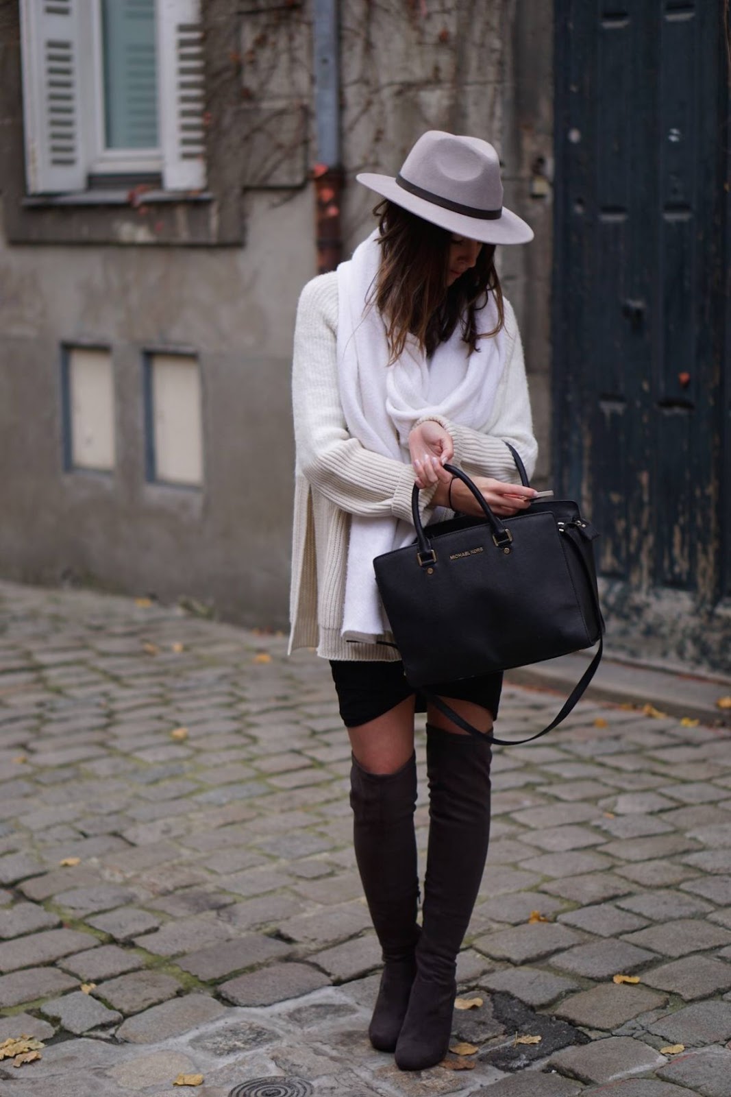 Comment associer la cuissarde ? Première idée, avec un slim. Pensez à décaler le côté trop sexy de la botte à un haut casual, comme une chemise fluide ou un gros pull un peu rentré dans le jean. On aime le mélange de la cuissarde avec les grosses mailles et les slims en similicuir. Le mélange de matières fait toujours son petit effet ! Pensez également aux manteaux longs et aux trench. On peut accentuer le côté cocooning de la tenue avec une grosse écharpe, un bonnet, ou encore un chapeau décontracté style capeline.