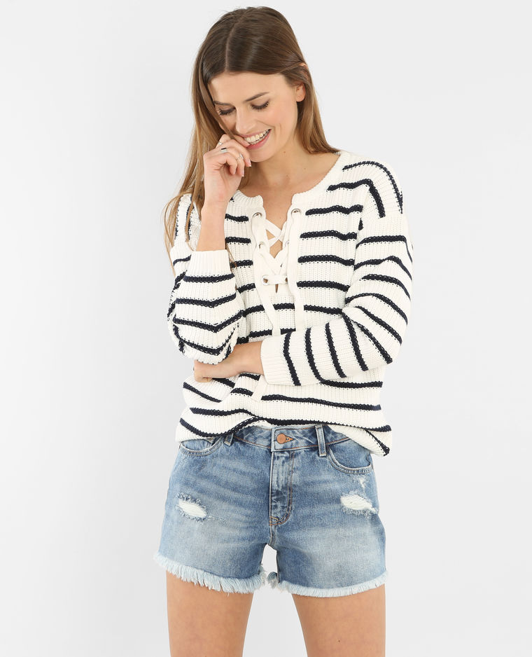 Rien de plus tendance et de plus comfy qu'un gros pull cette saison. Col roulé, col cheminée ou col V, la seule règle : du loose et de la maille. Petit coup de cœur sur les rayures façon marin et sur les découpes lace-up.