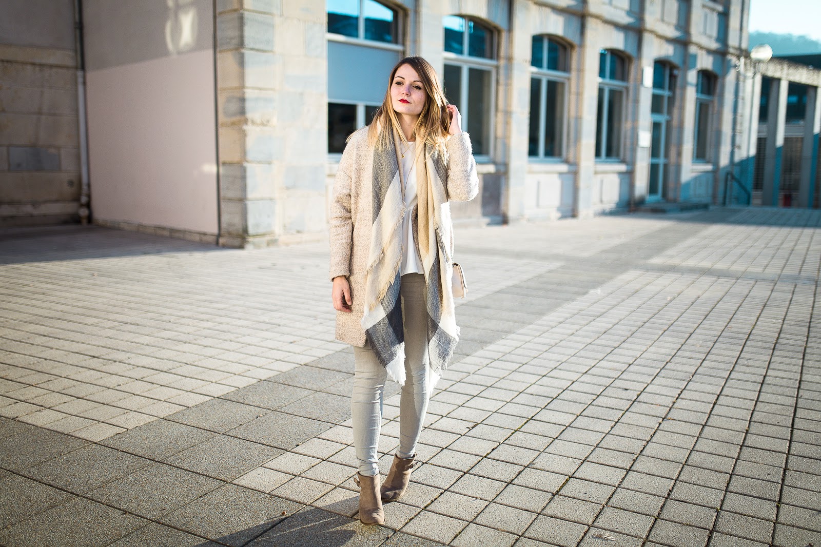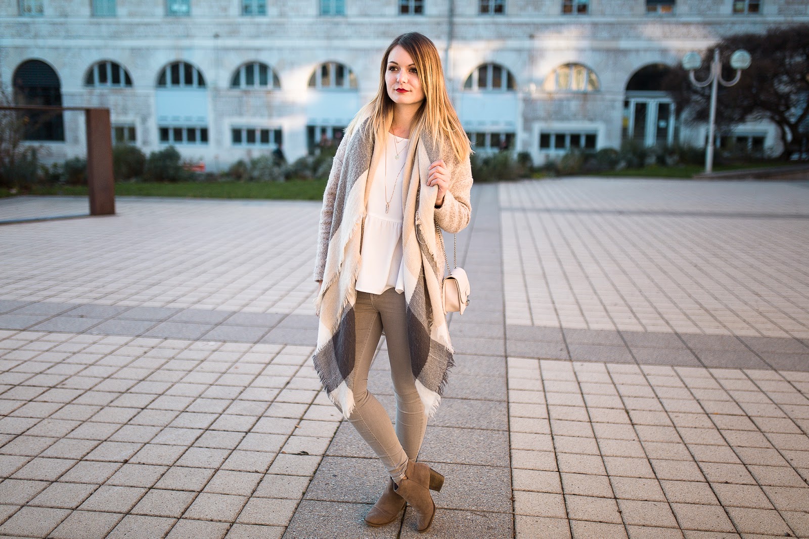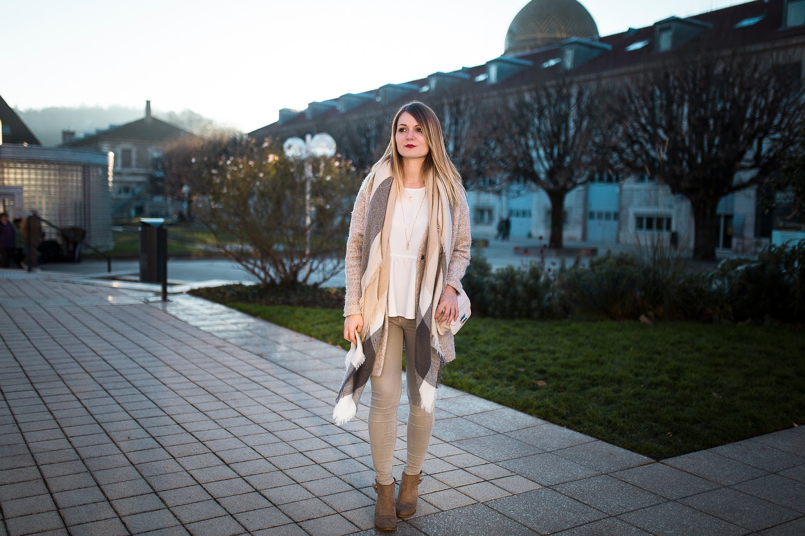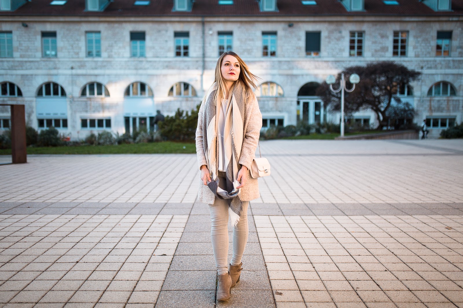 Un look nude dans une fraicheur quasi hivernale, au coucher du soleil : je remercie Maxime pour ces très jolies photos, qui changent de ce que je vous propose d'habitude. Je porte ici la version claire du top péplum Pimkie proposé en noir dans le dernier look.