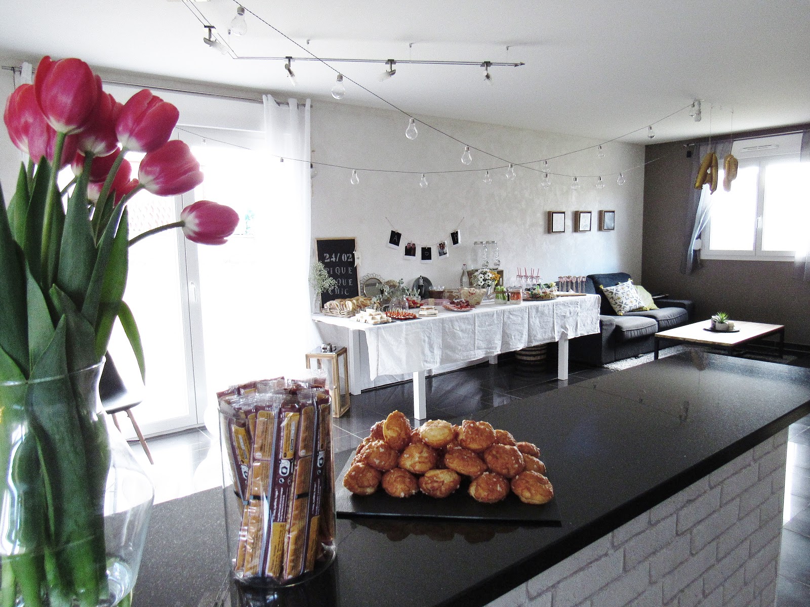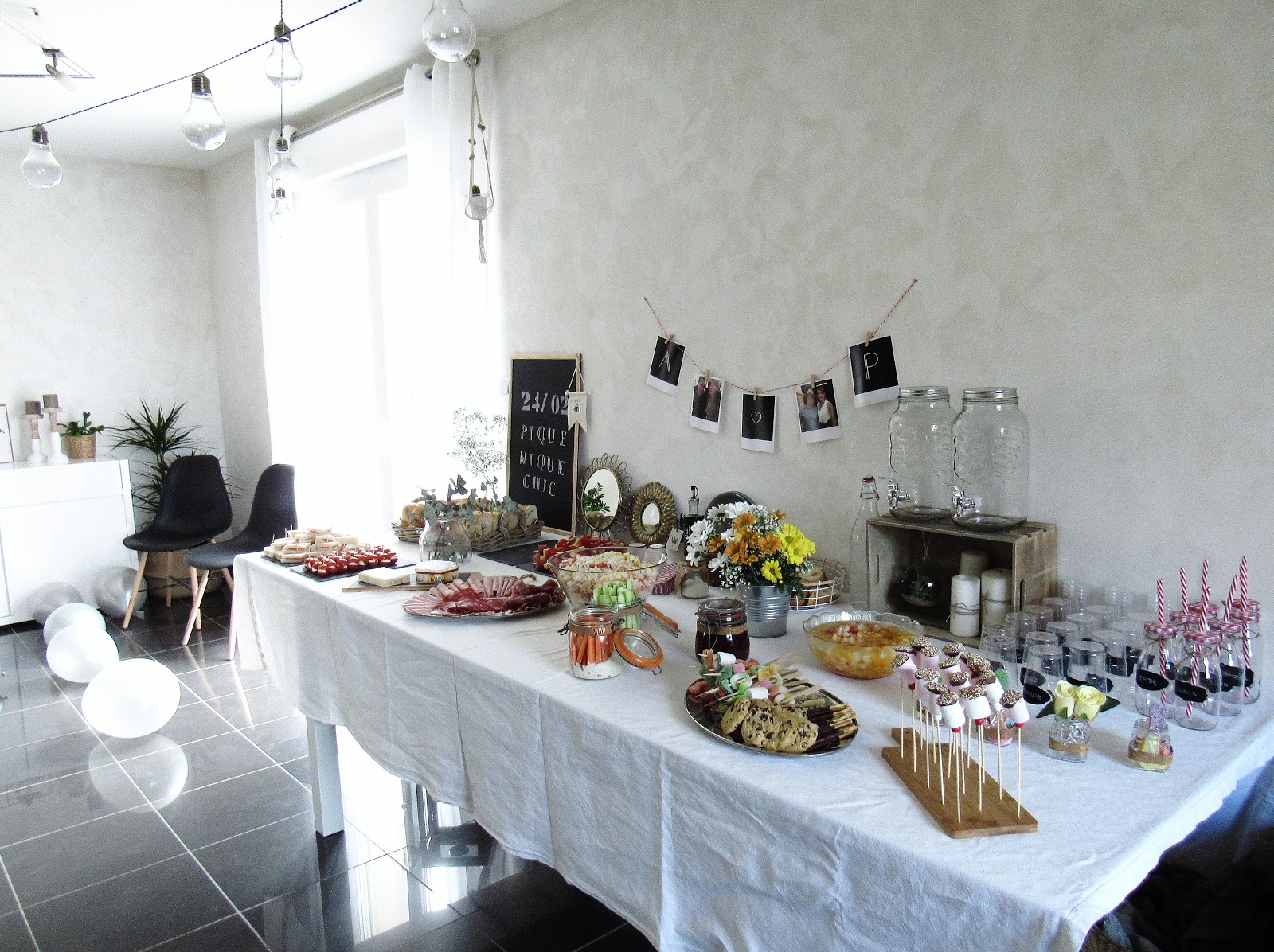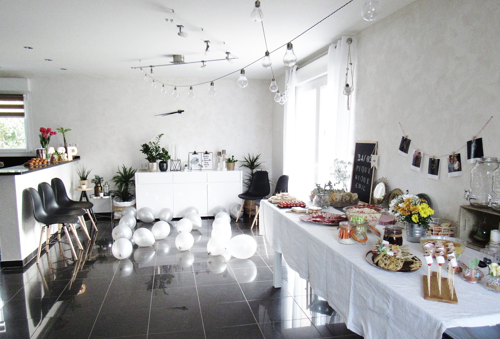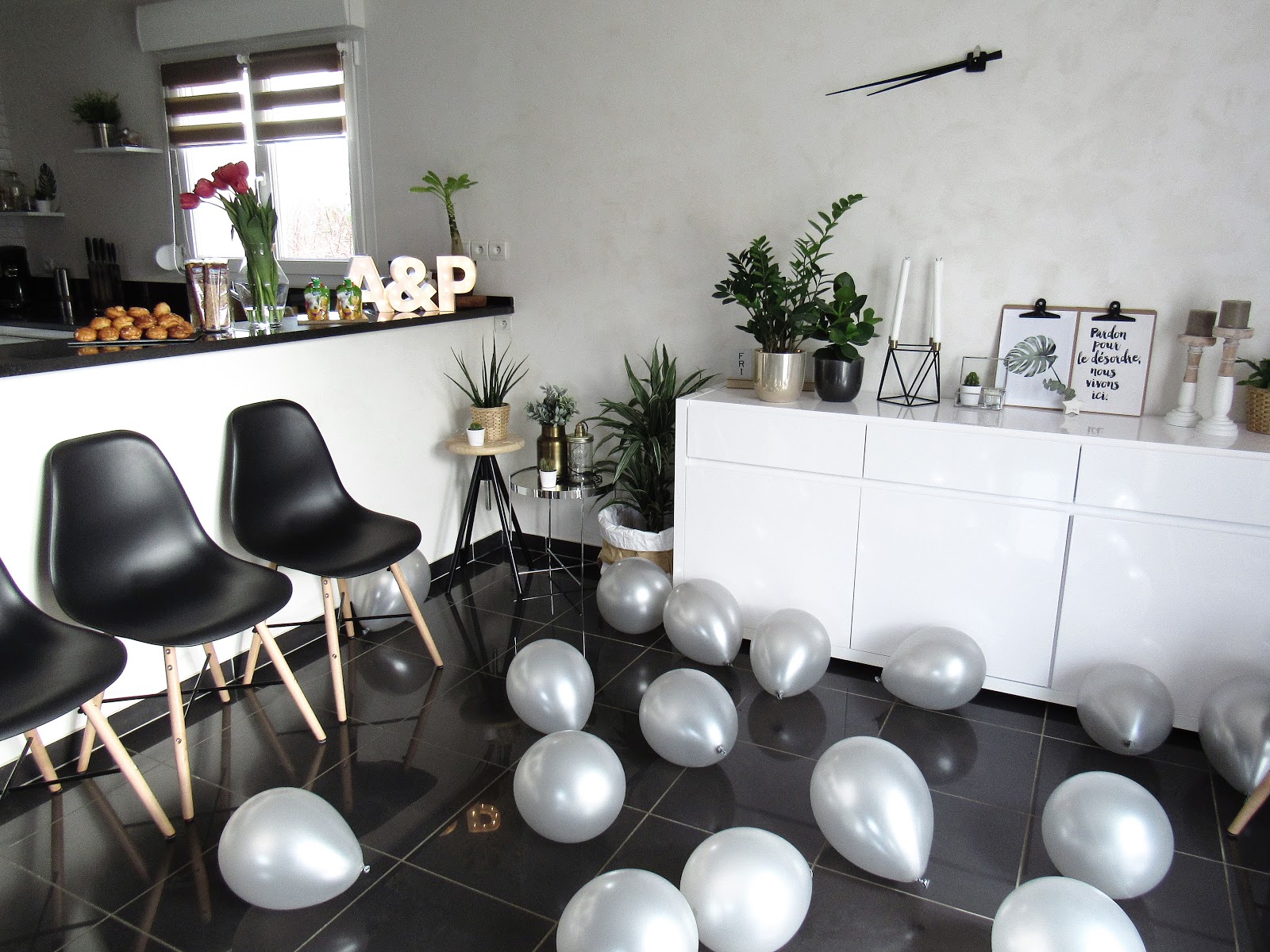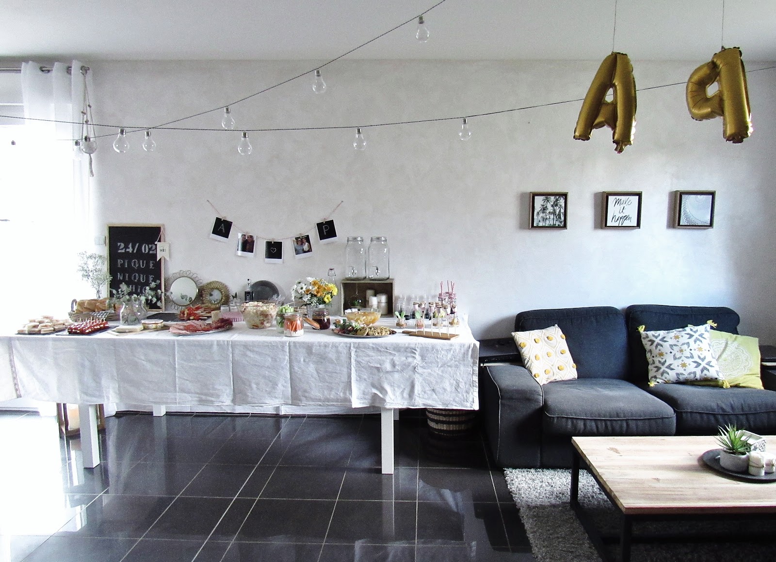 Au niveau de la décoration, j'ai opté pour deux guirlandes guinguettes (accrochées aux lustres et aux tringles de rideaux). Petit fail, vu le peu de soleil de ces derniers jours, peu de chance qu'elles s'allument ce soir ! Si vous cherchez des guirlandes guinguettes avec une prise, regardez à Ikea, Gifi, Natures et découvertes, dans les magasins d'articles de fêtes et dans les jardineries. J'ai également disposé des ballons argentés au sol et un petit DIY (inspiré de cette photo) au mur. J'ai déniché chez Hema les lettres A & P lumineuses et personnalisables : en carton, on peut les peindre et les décorer, mais elles ont été laissées ici telles quelles.