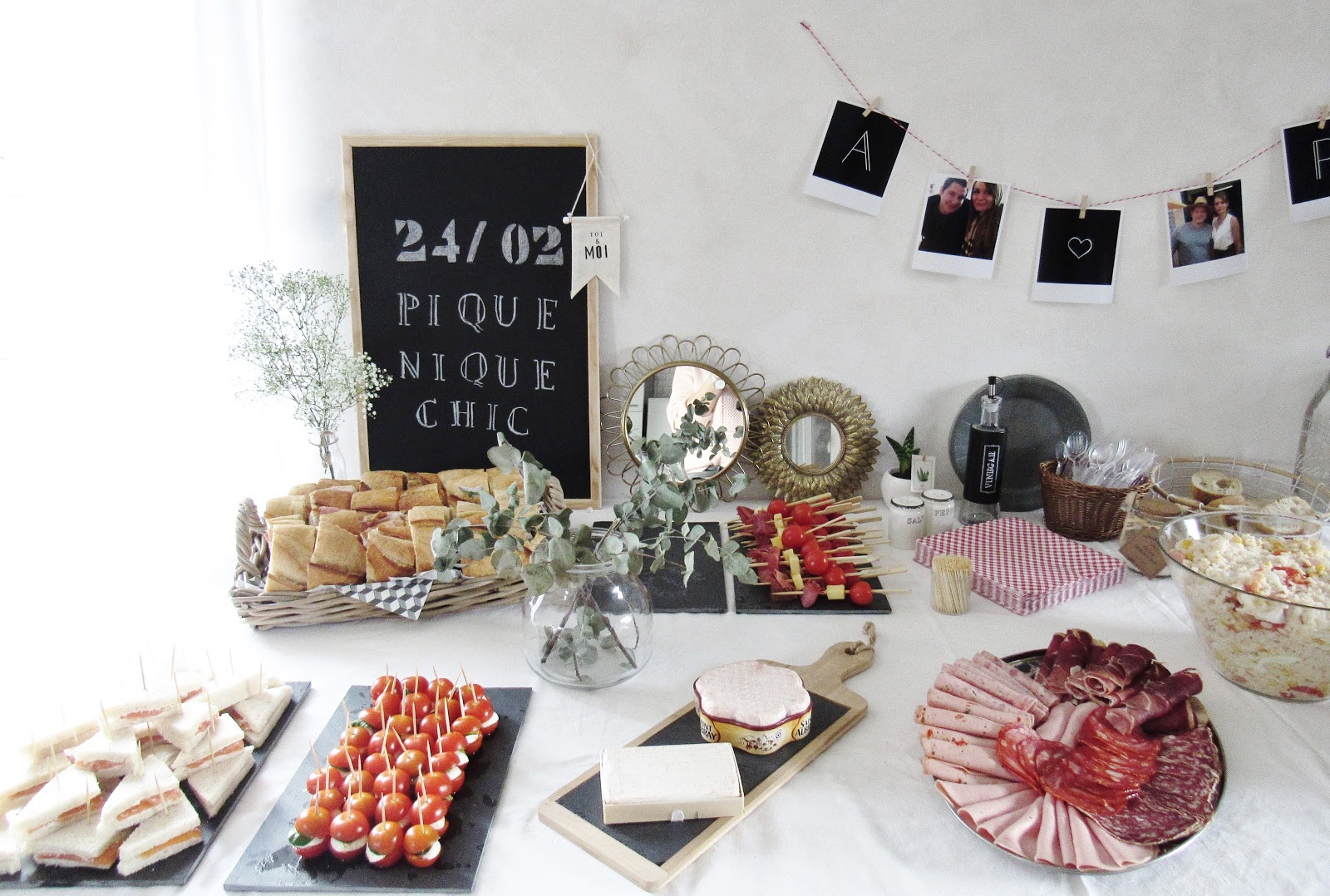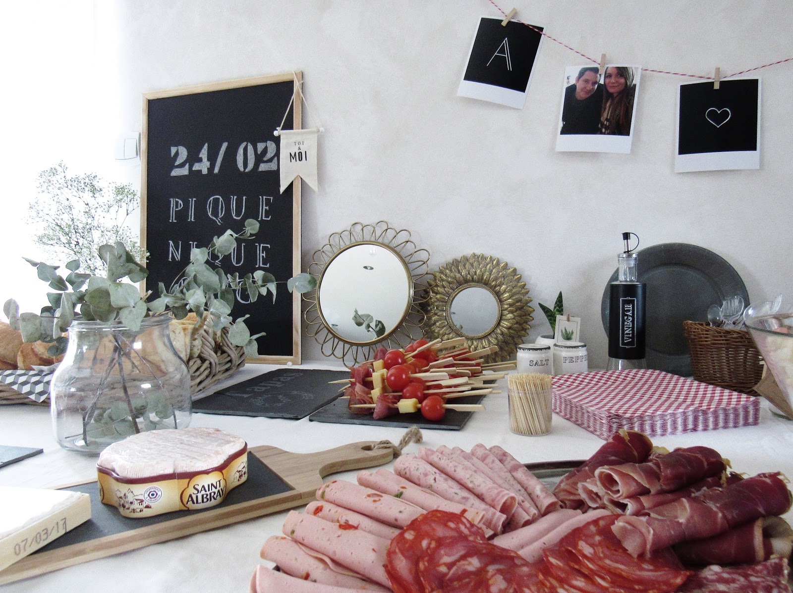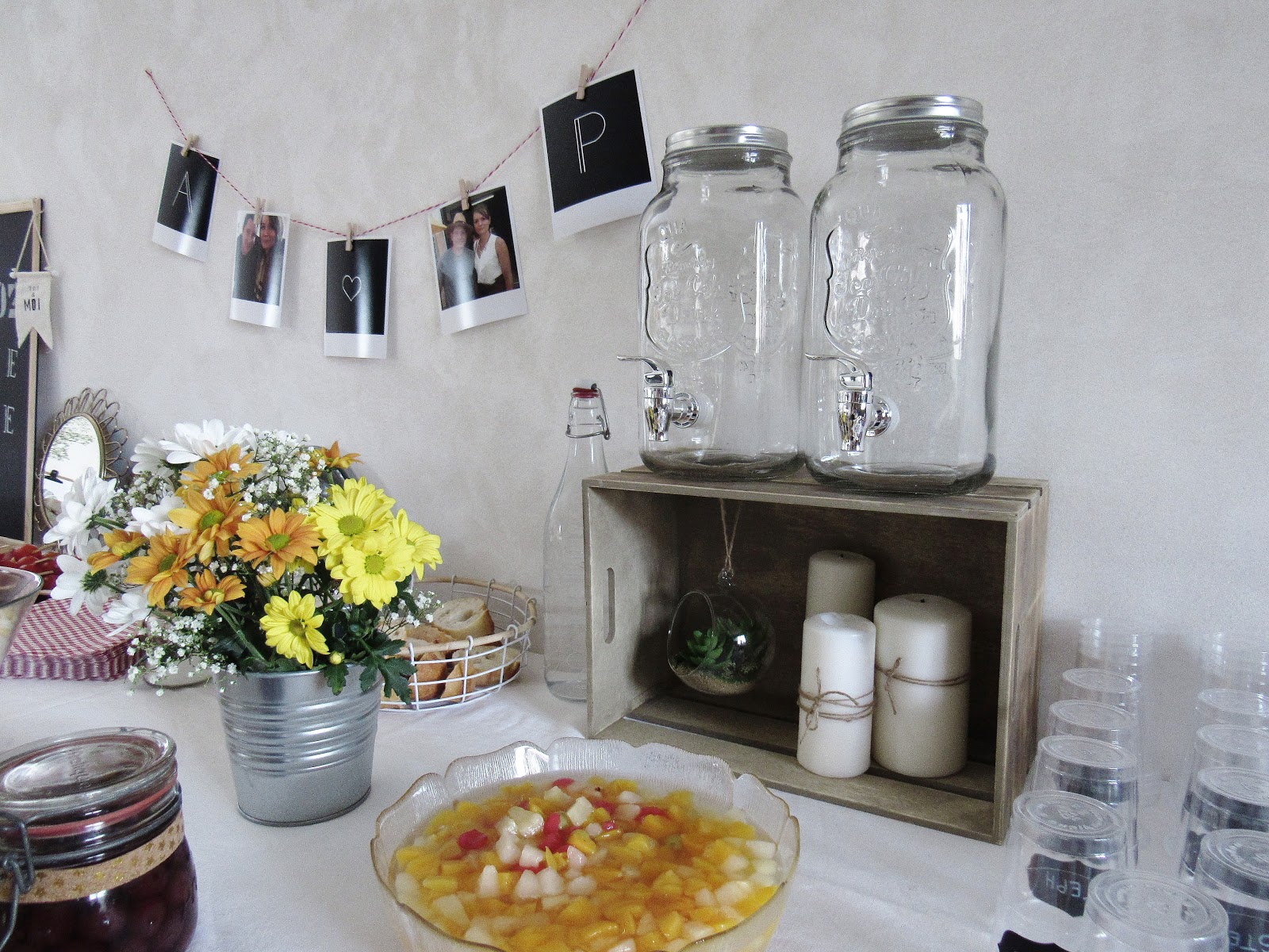 Nappe - Brocante / Ardoise - Retif / Petites ardoises, plateau en osier, plateau à brochettes, contenants à sauces, petit panier tressé, bouteilles en verre, étiquettes pour verres, rouleaux de liège décorés adhésifs - Action / Cagette en bois - Centrakor / Polaroïds - Cheerz (reçus en seulement deux jours) / Fanion - Servi'Mag / Bouquet de fleurs, Aloé Vera - Fleuriste / Miroirs - H&M Home et Maisons du Monde / Bougies, Pot en fer - Ikea / Jarres avec robinet, limonades - Hema / Terrarium à suspendre, serviettes en papier géométriques - Maisons du Monde / Bouteilles avec pailles, petit pot à sucre - Tout à deux euros.
