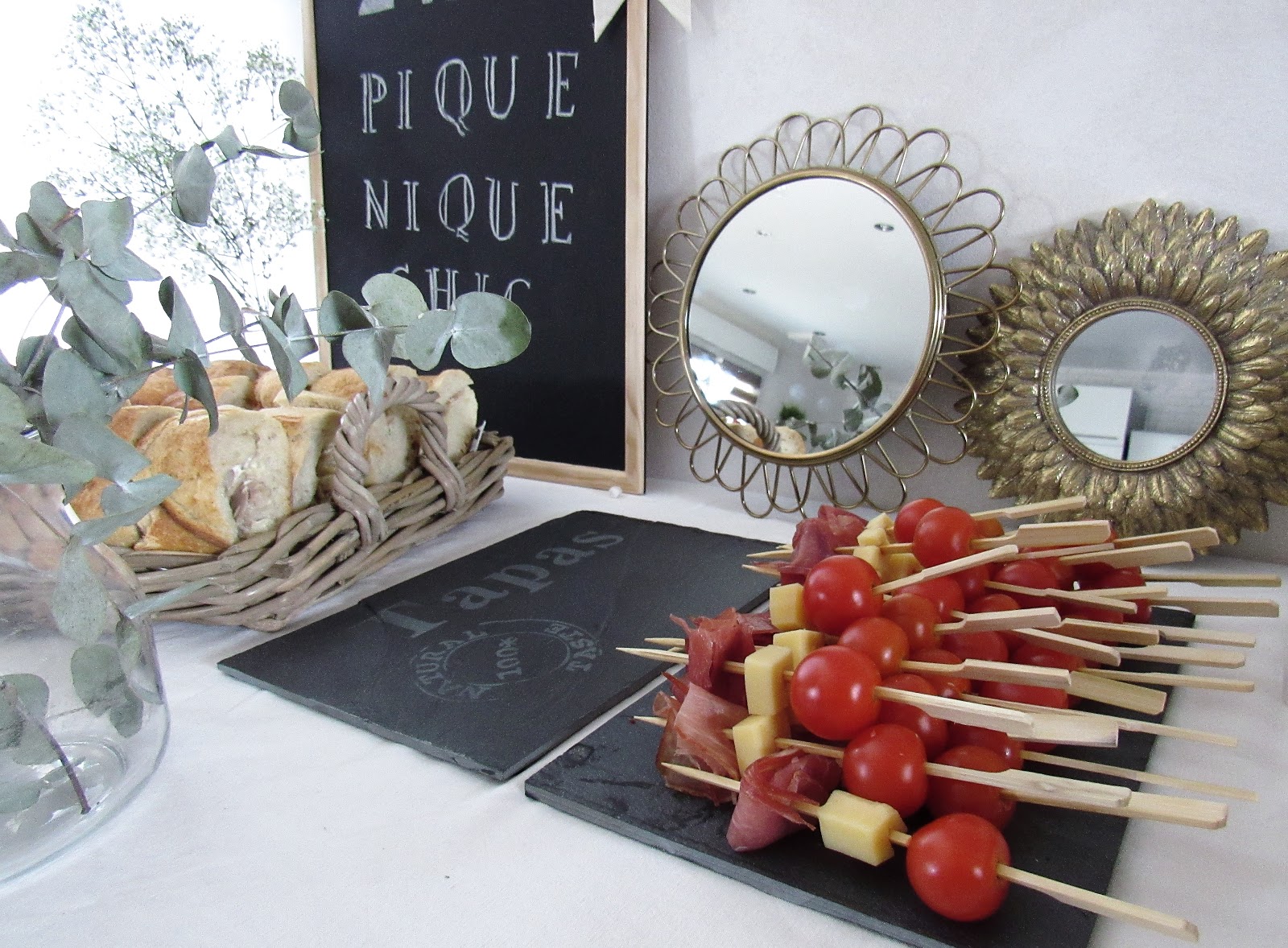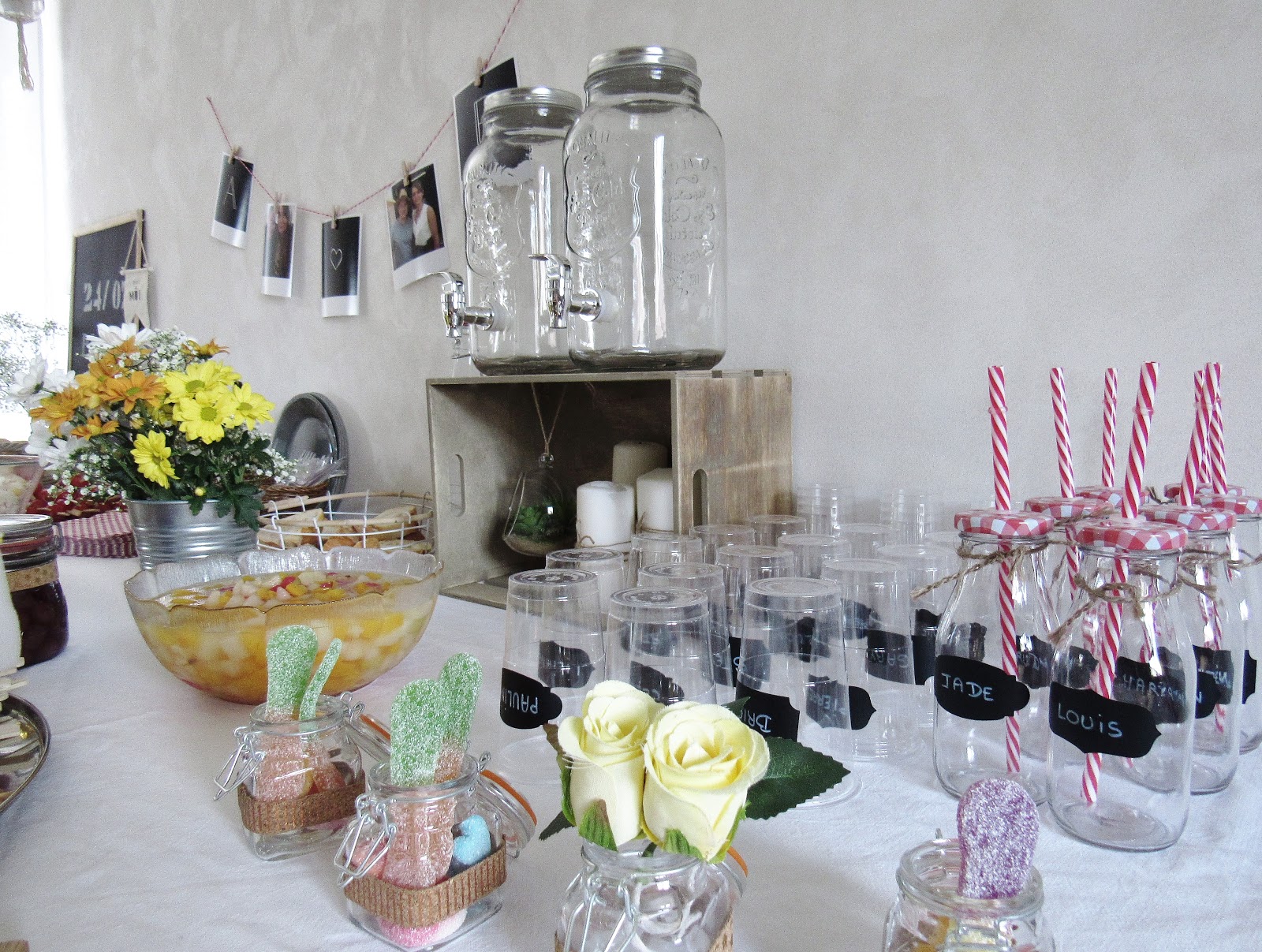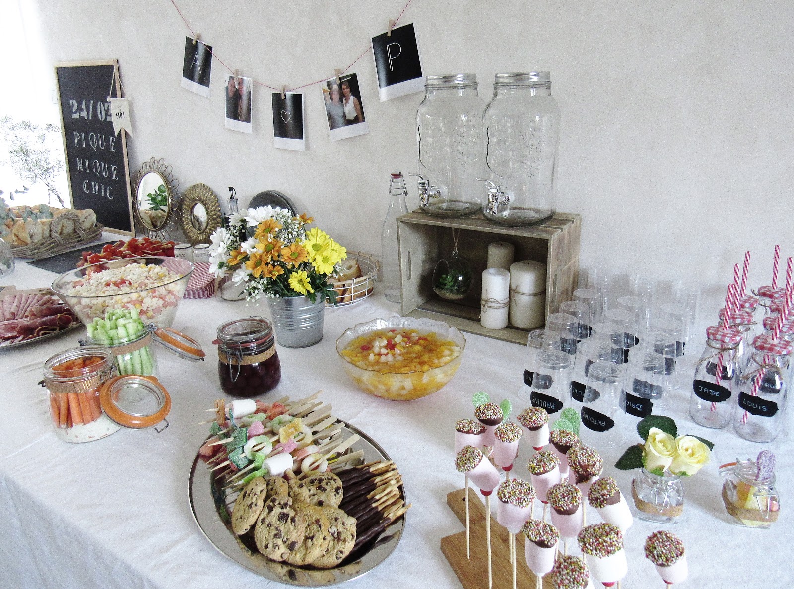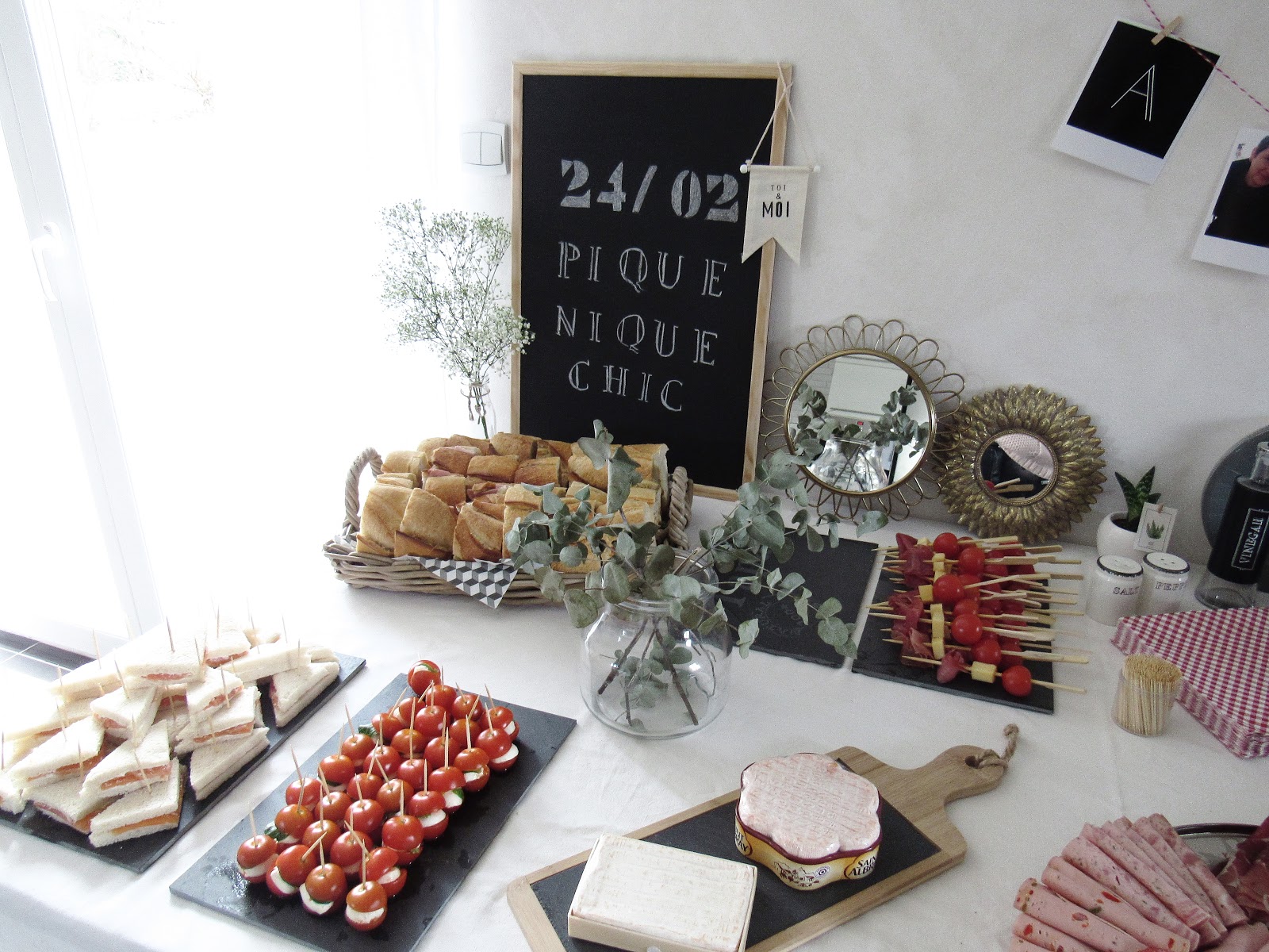Nappe - Brocante / Ardoise - Retif / Petites ardoises, plateau en osier, plateau à brochettes, contenants à sauces, petit panier tressé, bouteilles en verre, étiquettes pour verres, rouleaux de liège décorés adhésifs - Action / Cagette en bois - Centrakor / Polaroïds - Cheerz (reçus en seulement deux jours) / Fanion - Servi'Mag / Bouquet de fleurs, Aloé Vera - Fleuriste / Miroirs - H&M Home et Maisons du Monde / Bougies, Pot en fer - Ikea / Jarres avec robinet, limonades - Hema / Terrarium à suspendre, serviettes en papier géométriques - Maisons du Monde / Bouteilles avec pailles, petit pot à sucre - Tout à deux euros.