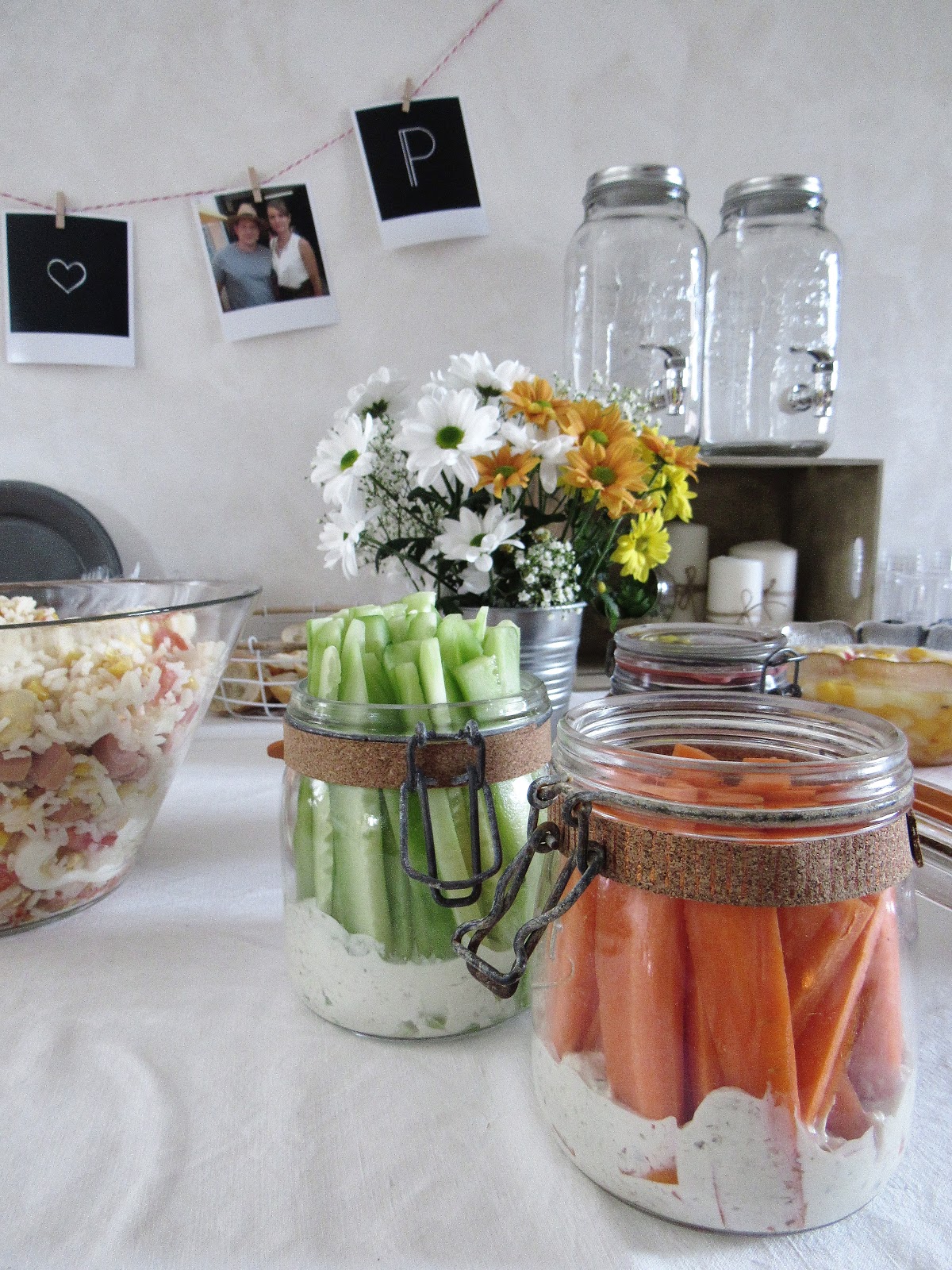 Pour la table, je suis donc partie sur quelque chose d'assez naturel, avec un vieux drap qui fait office de nappe champêtre, des cagettes, des jarres pour les boissons, des ardoises et des paniers en osier pour la nourriture, des fleurs..