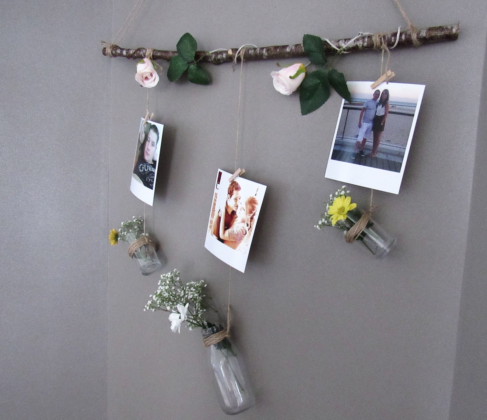 Guirlandes solaires (12€ l'unité pour 4,5 m) - Servi'Mag / Ballons argentés, ballons lettres, lettres lumineuses - Hema. Rien de bien compliqué pour le portant à fleurs : une branche de bois trouvée à la campagne, de la corde, des récipients en verre (ici 2 pots à bougie et une des bouteilles avec paille vue sur la table), des fleurs et quelques photos. Les roses sont des fausses de chez Action, bien pratiques à entortiller autour de la branche avec leur tige en fil de fer.