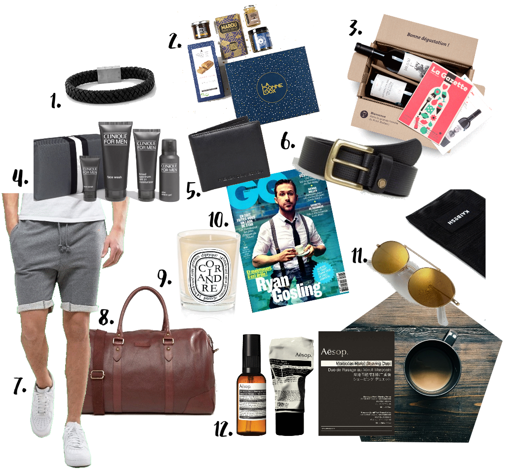 1. Bracelet noir tressé Trendhim - 25,95 € / 2. La bonne Box, Épicerie Fine - dès 24 €/ mois / 3. Box de vin Le Petit Ballon - à partir de 19,90 €/mois / 4. Coffret Clinique - 41,10 € / 5. Porte-monnaie French Connection sur Asos - 15,99 € / 6. Ceinture French Connection sur Asos - 29,99 € / 7. Short en molleton Jack & Jones - 16,99 € / 8. Sac Barney's sur Asos - 166,99 € / 9. Bougie Diptyque Coriandre sur Les Appartements de Juju - 46 € / 10. Abonnement à un magazine masculin / 11. Lunettes Kaibosh sur Asos - 46,99 € / 12. Duo de rasage Aesop - 65 €.