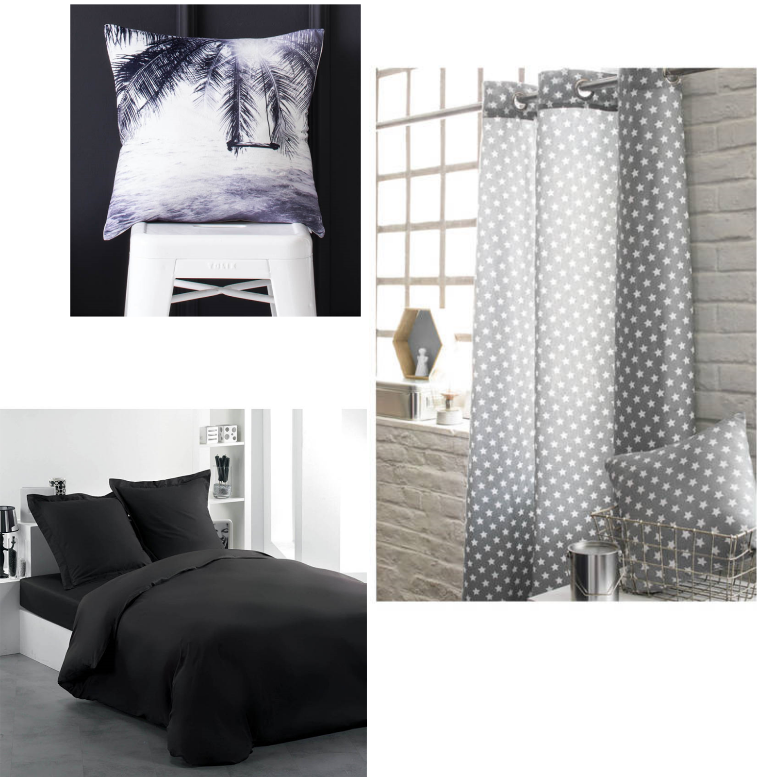 Coussin imprimé palmier - 9,99 € / Rideau étoilé - 15,99 € / Housse de couette noire - 24,99 €.