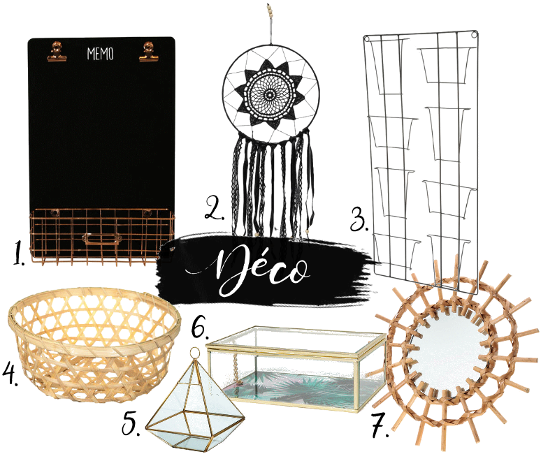 1. Memo ardoise - 14,99 € / 2. Attrape-rêves - 5,99 € / 3. Porte-carte mural - 9,99 € / 4. Panier bambou - 4,59 € le grand modèle / 5. Terrarium - 9,99 € / 6. Boite à bijoux - 12,99 € / 7. Miroir soleil osier - 9,09 €.