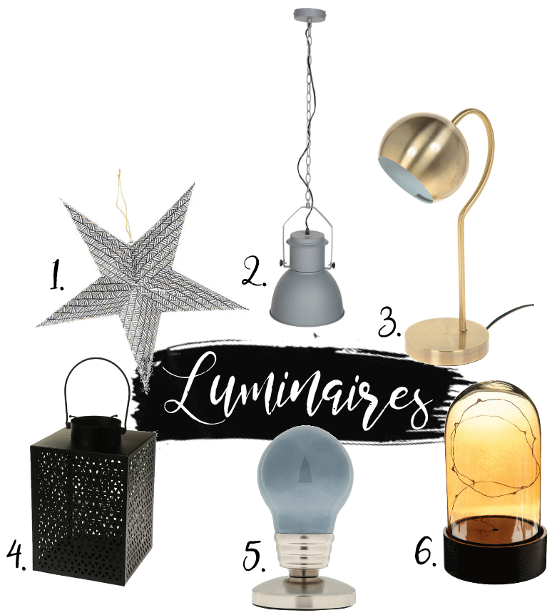 1. Etoile lumineuse - 9,99 € / 2. Suspension en métal - 39,99 € / 3. Lampe bureau dorée - 29,99 € / 4. Lanterne métal noir - 19,99 € / 5. Lampe ampoule - 11,89 € / 6. Lampe cloche gold - 9,99 €.