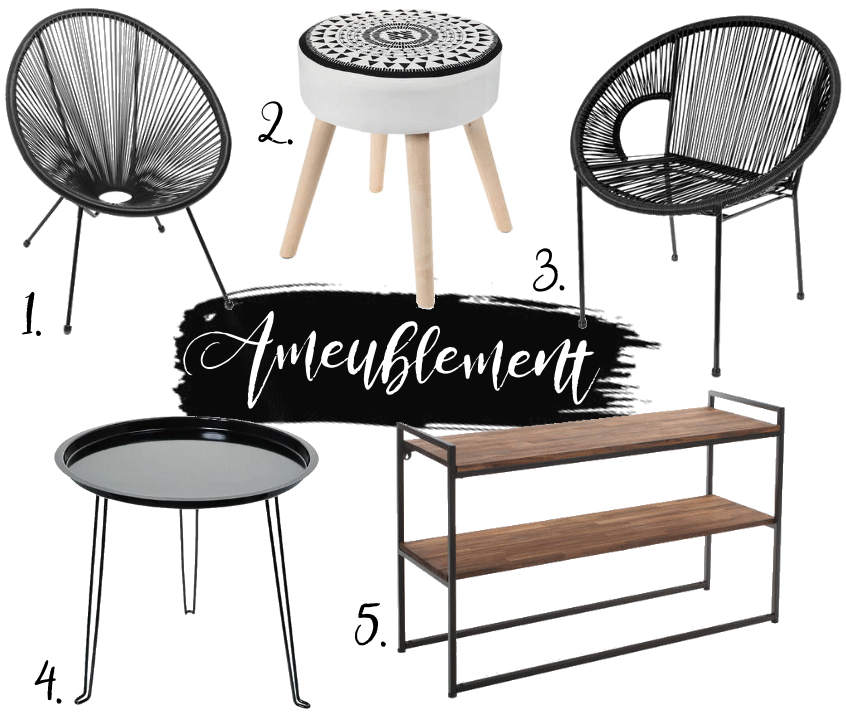 1. Fauteuil noir rond - 49,99 € / 2. Tabouret nordique - 17,99 € / 3. Fauteuil noir carré - 29,99 € / 4. Table ronde métal noir - 9,99 € / 5. Console sur roulettes - 129,99 €