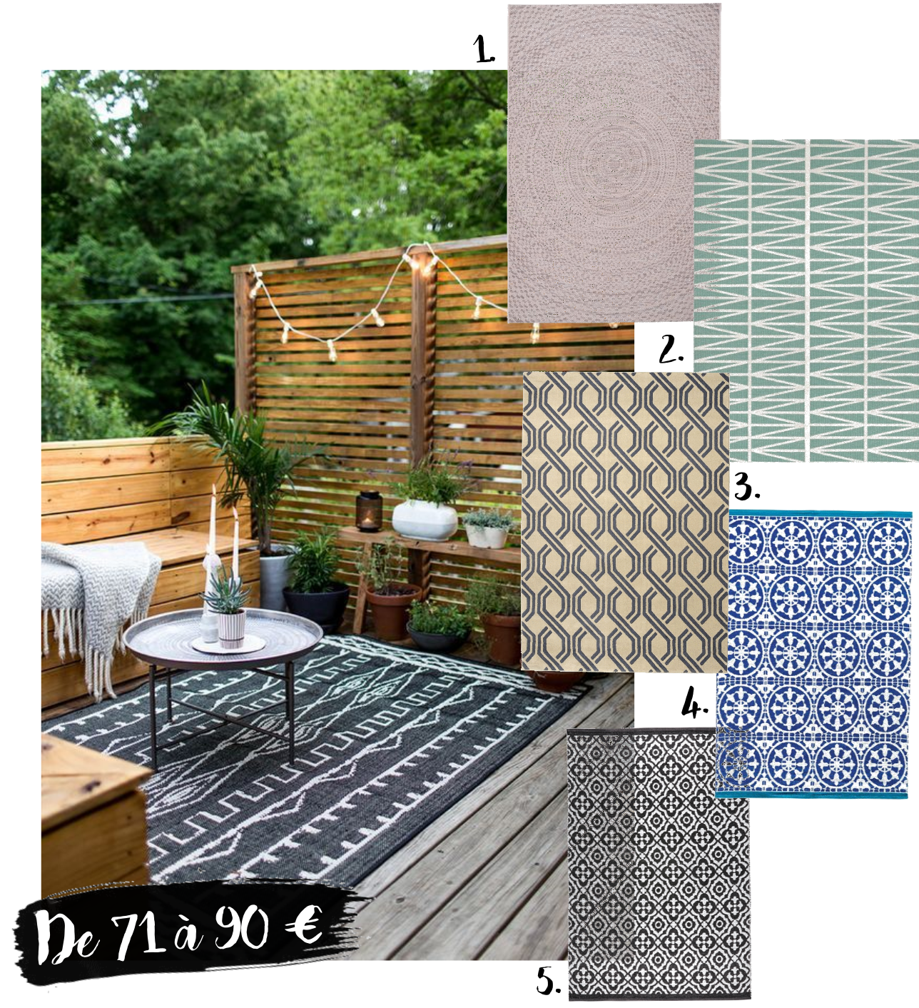 1. Alinea - 71,90 € / 2. Tapis Chic - 79 € / 3. Casa - 85 € / 4. Maisons du Monde - 89,90 € / 5. Maisons du Monde - 89,90 €.
