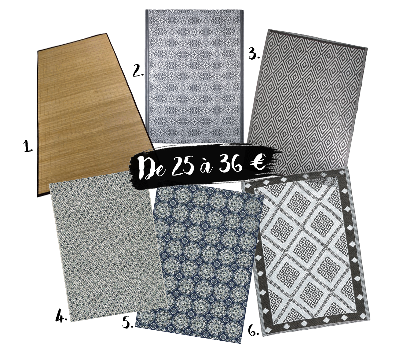 1. AlloTapis - 39 € / 2. AlloTapis - 39 € / 3. AlloTapis - 39 € / 4. Maisons du Monde - 39,90 € / 5. La Redoute - 43,90 € /