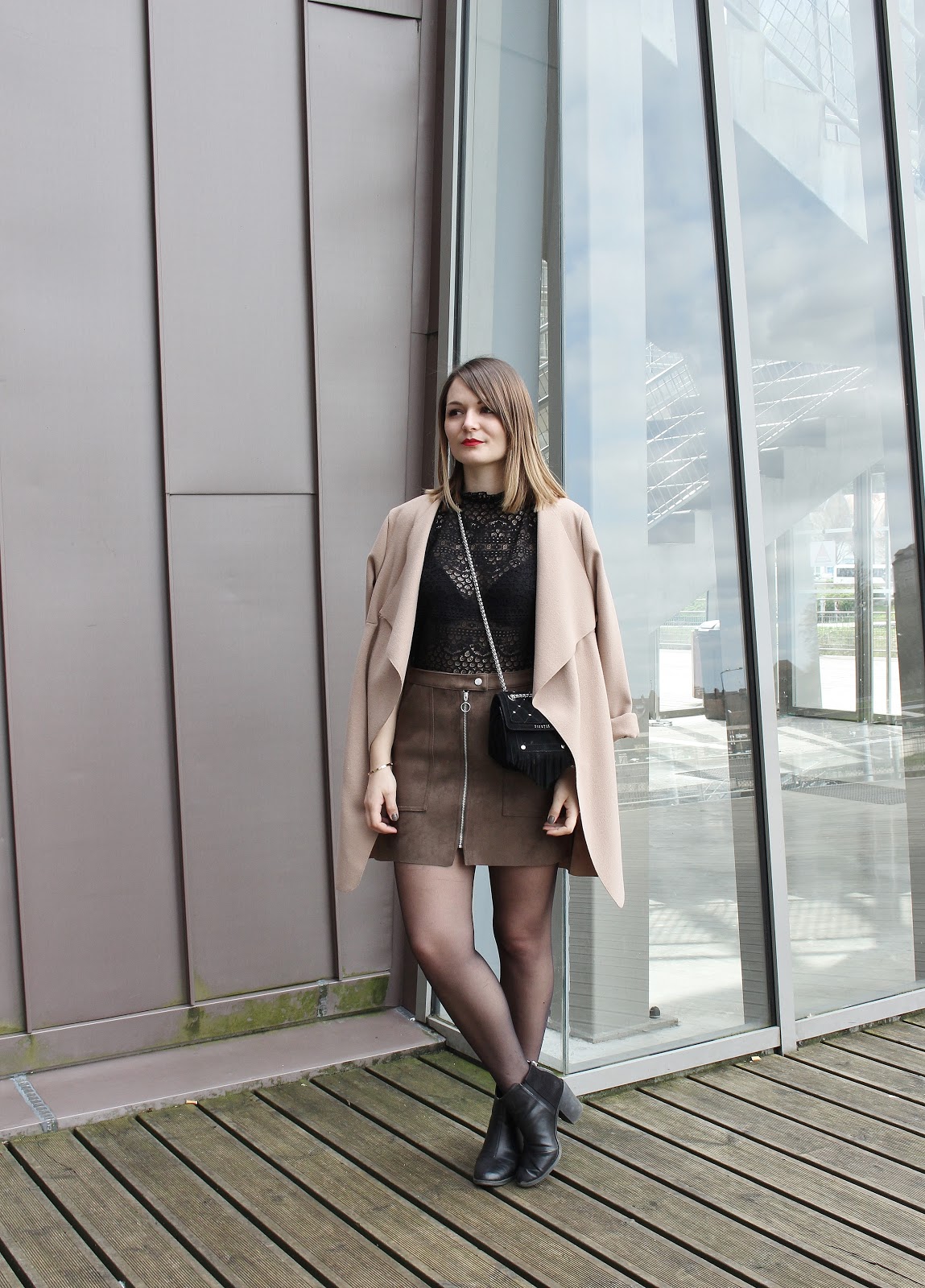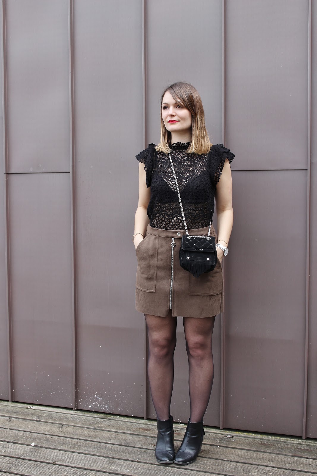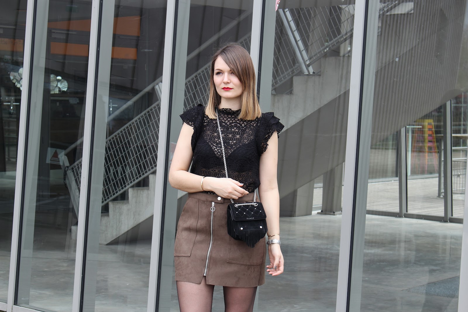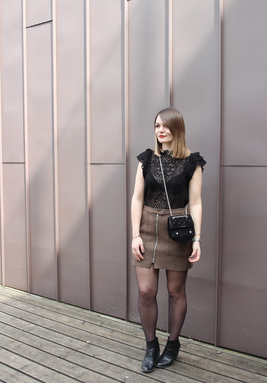 Une jolie terrasse en bois, des baies vitrées immenses : la Rodia est un endroit parfait pour ce look suédine et dentelle. Niveau tenue, deux nouveautés : le joli top Mango (dispo également en blanc), tout en dentelle et au joli col ; la jupe Bershka (dispo quant à elle aussi en noir), à la coupe parfaite. Merci Léa Comptoir au Féminin pour ces jolies photos.