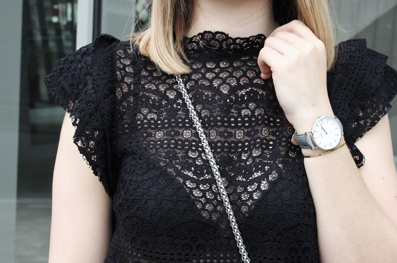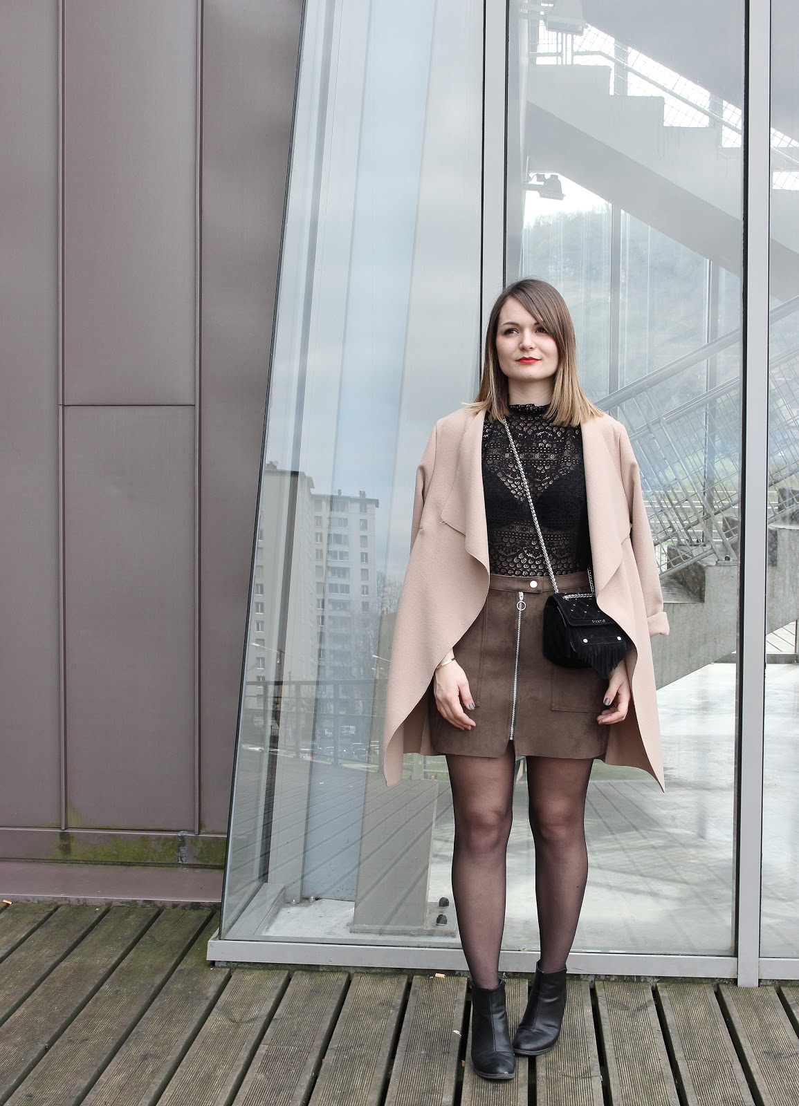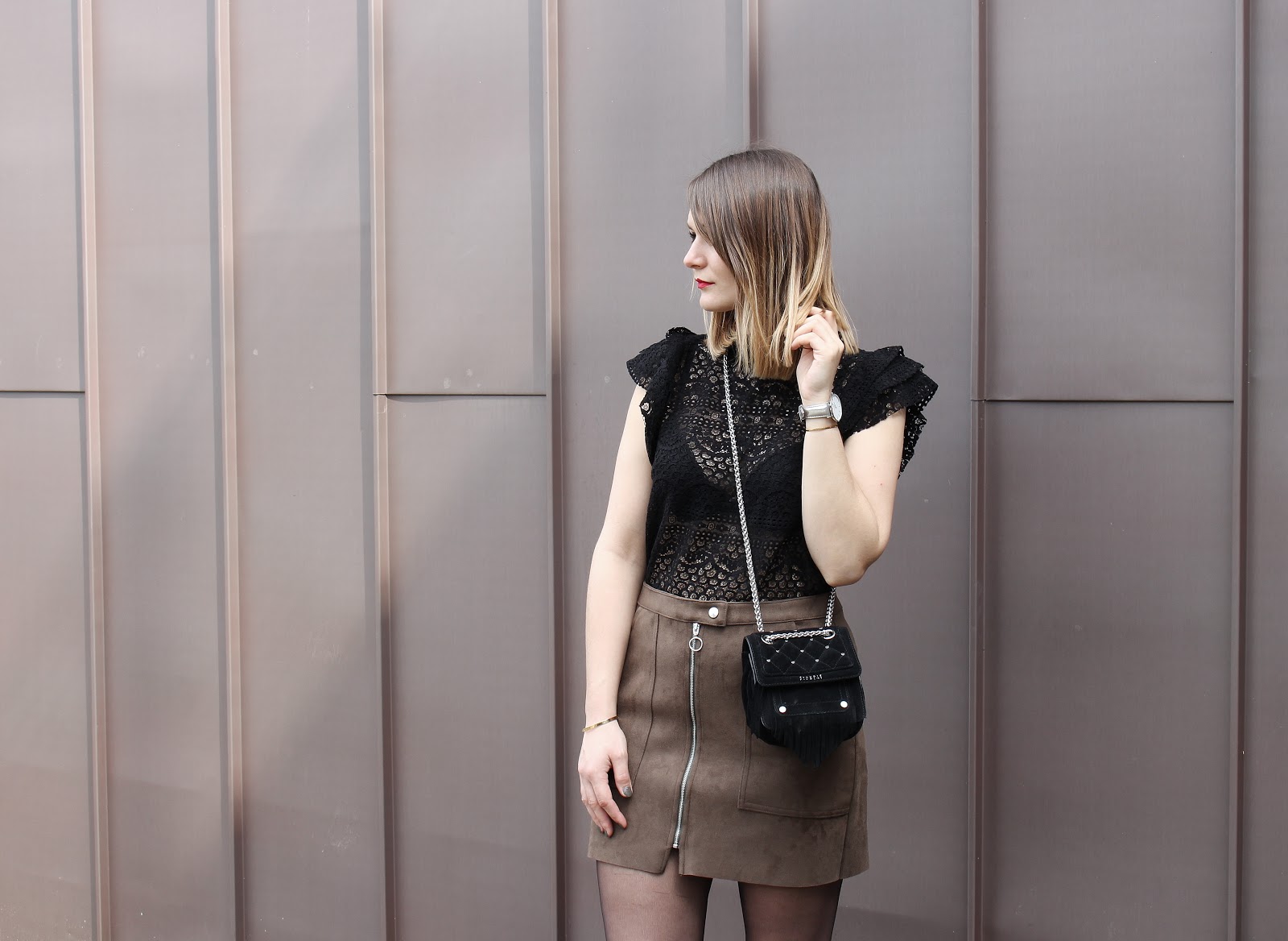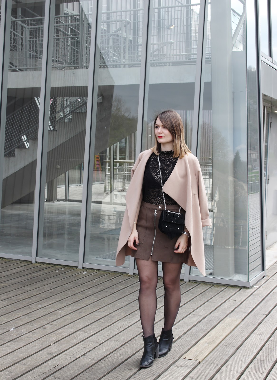 Une jolie terrasse en bois, des baies vitrées immenses : la Rodia est un endroit parfait pour ce look suédine et dentelle. Niveau tenue, deux nouveautés : le joli top Mango (dispo également en blanc), tout en dentelle et au joli col ; la jupe Bershka (dispo quant à elle aussi en noir), à la coupe parfaite. Merci Léa Comptoir au Féminin pour ces jolies photos.