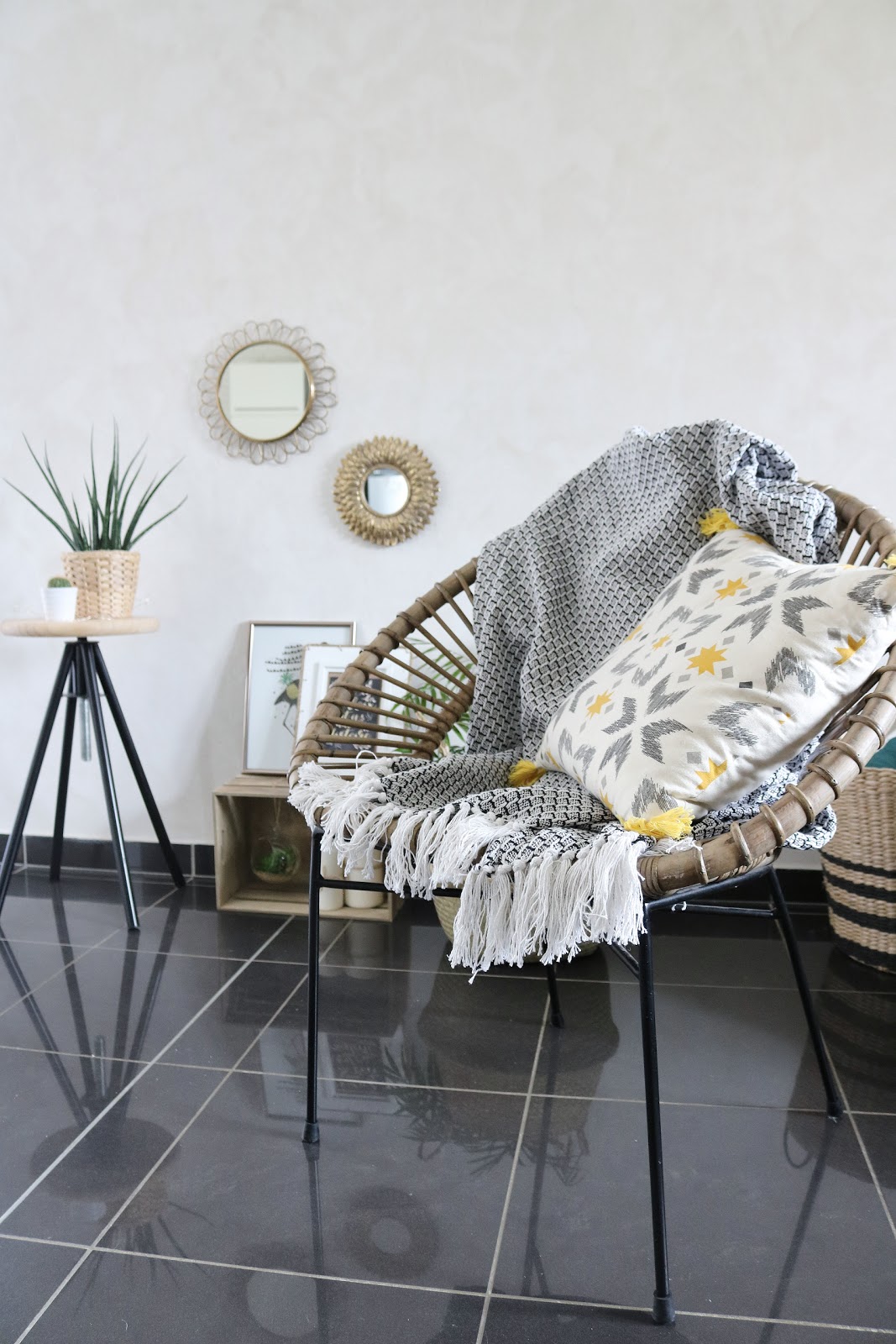 Premier craquage : ce plaid graphique bleu et blanc. L'idée était de le mettre sur ce fauteuil en rotin, où il a déjà trouvé sa place.