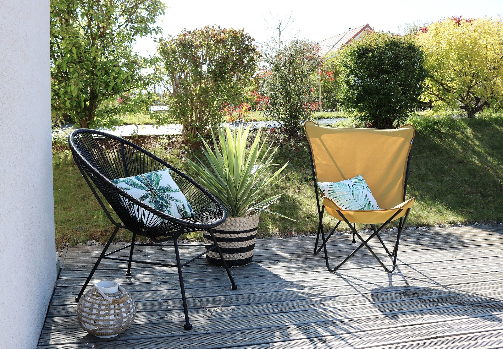 Action m'a épaté avec ces jolis coussins tropicaux. Il y avait 5-6 modèles au choix : cactus, palmiers, feuilles de monstera... Un vrai bon plan pour des coussins (et des intérieurs de coussins) qui vont passer leur été sur la terrasse. La lanterne en bois blanc est également nouvelle. Je posséde déjà le panier rayé, dans lequel je mets les plaids à côté du canapé, mais celui-la est parfait comme cache-pot. La plante à l'intérieur vient de Carrefour, et ne coûtait que 20€.